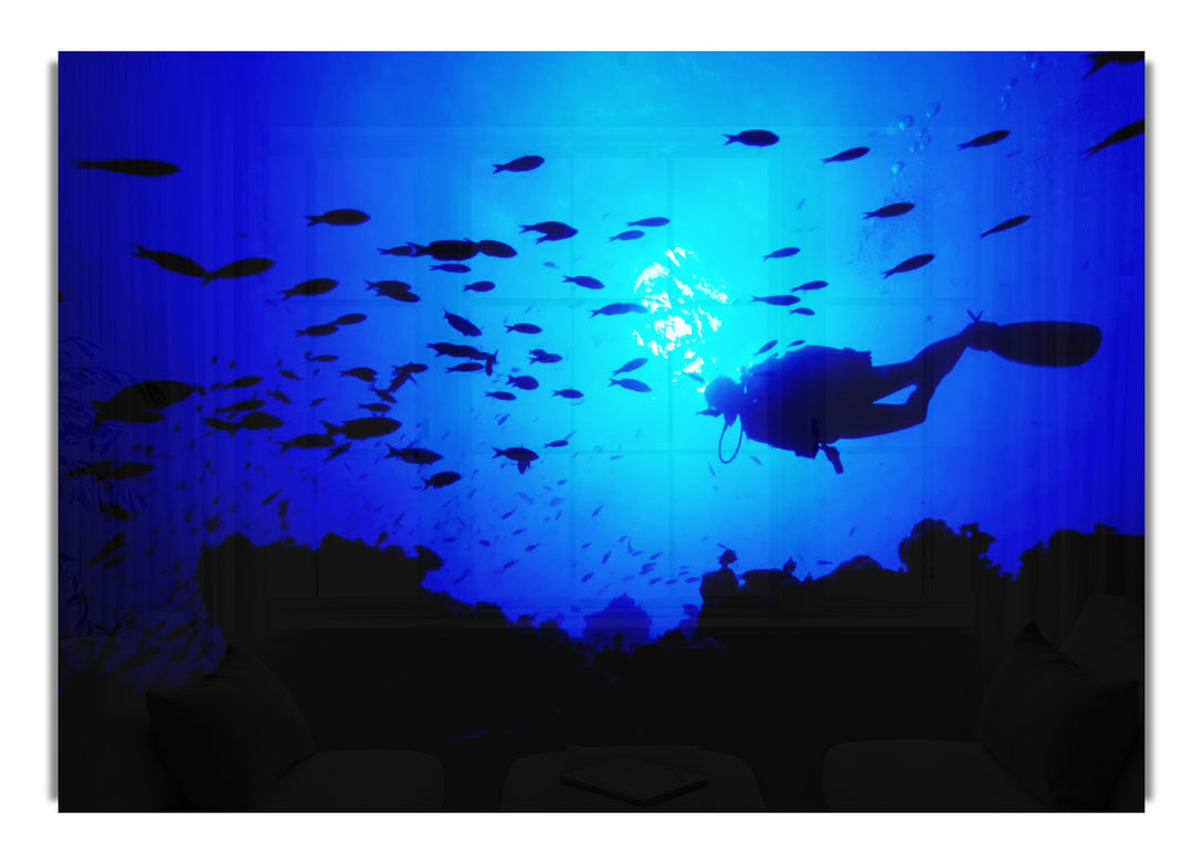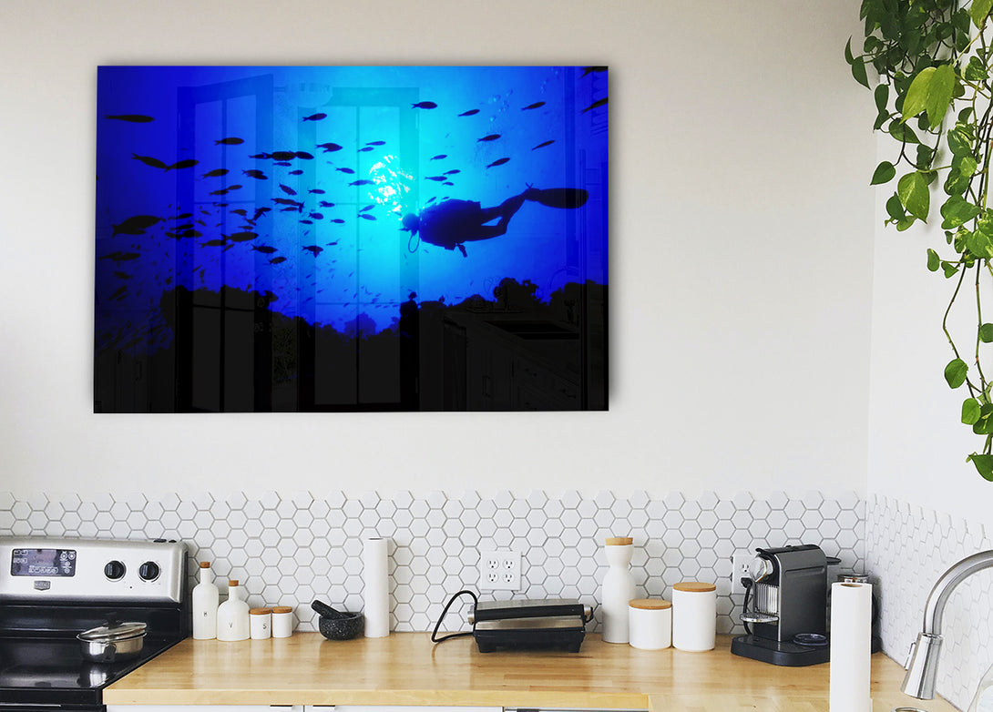 Divers City acrylic print, UV printed onto 5mm thick acrylic glass. Comes with everything you need to hang on your wall.