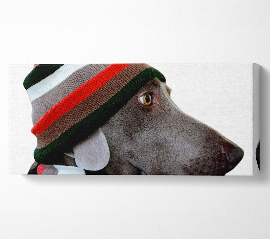 Dog Funny Hat canvas, printed on coated polyester canvas. Mounted on to a 44mm box frame, ready to hang.