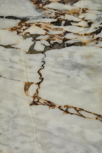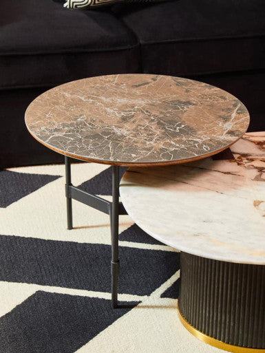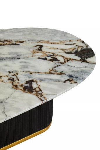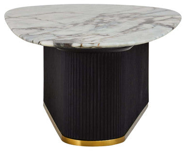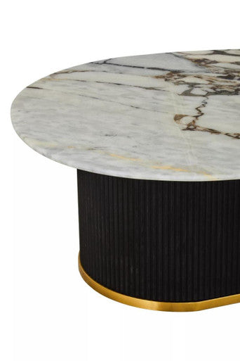 This coffee table has a striking contrast of a rounded white marble top with a dark wood base that has a golden trim. Featuring a fluted pattern, the sturdy dark wood base creates visual interest with unique design details and dimensions.