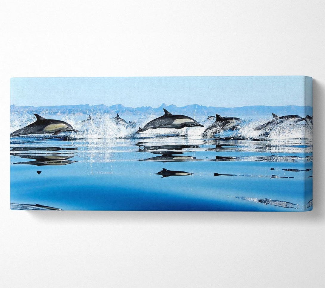 Dolphins In The Sea canvas, printed on coated polyester canvas. Mounted on to a 44mm box frame, ready to hang.