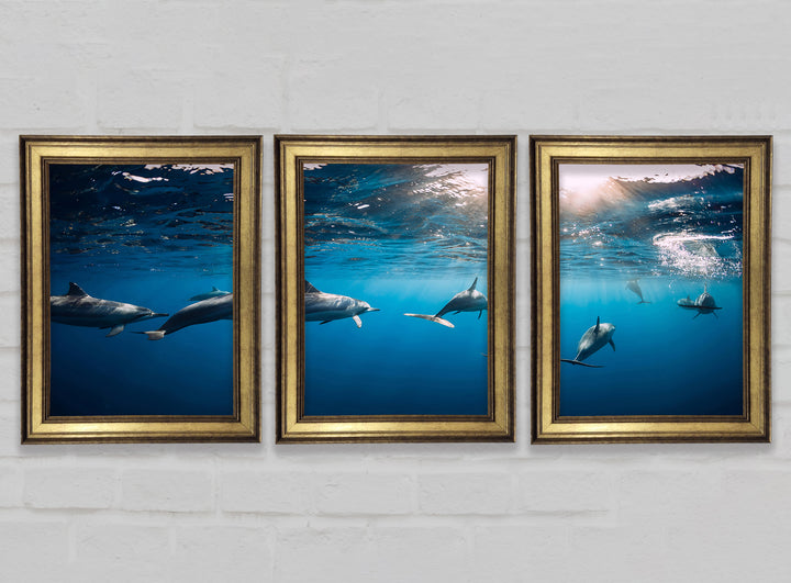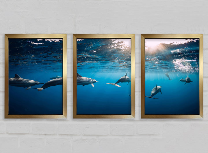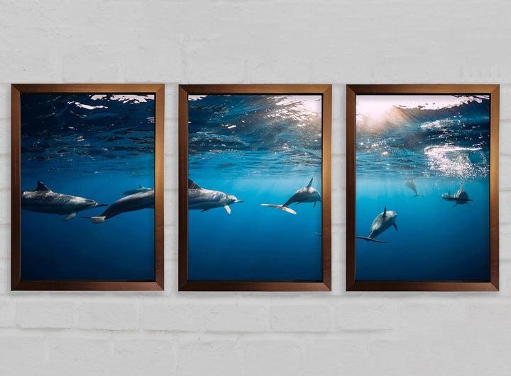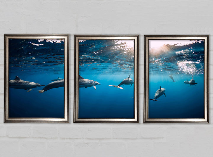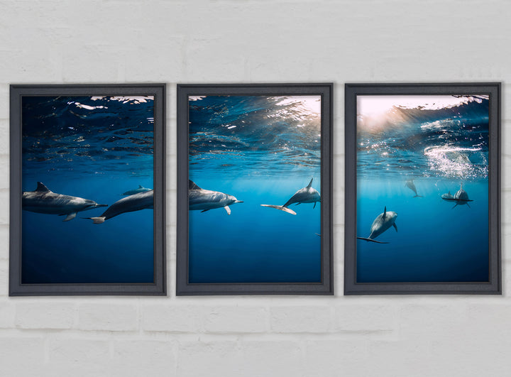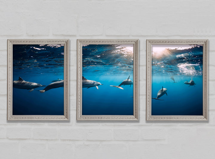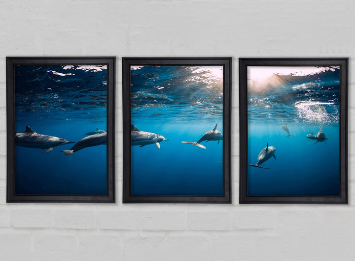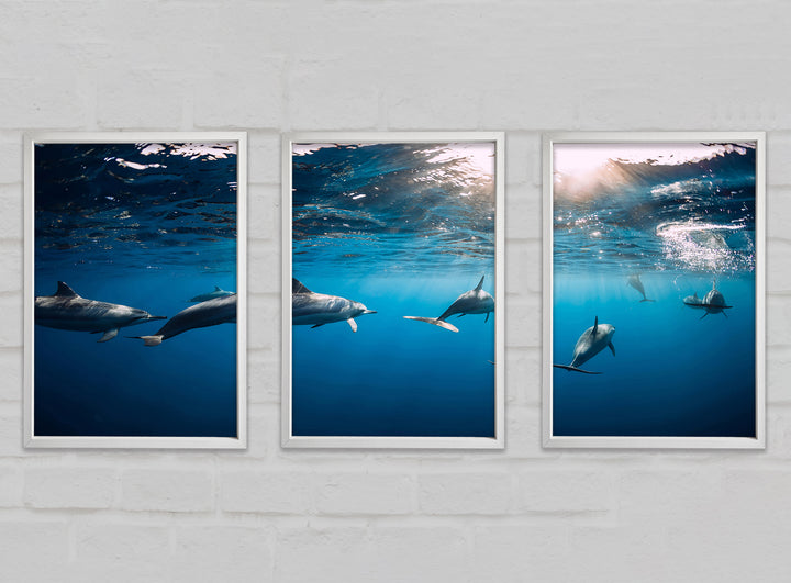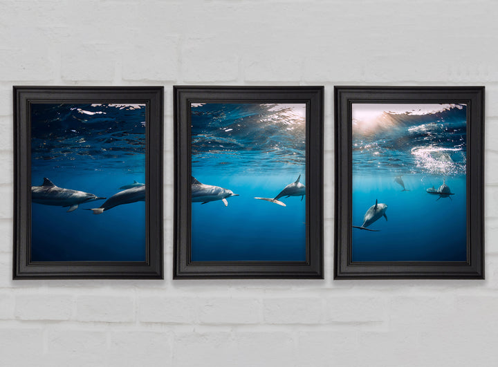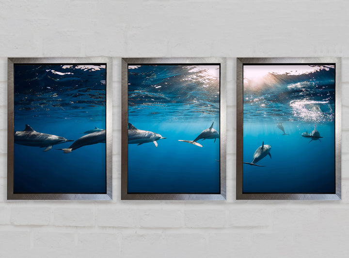 Dolphins set of 3 framed print wall art, available in mutiple frame colours. Ready to hang from the box and handmade in the United Kingdom.