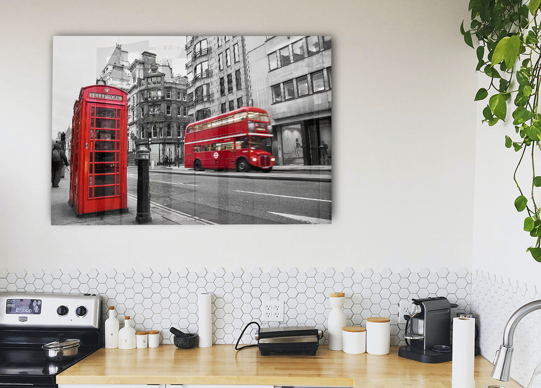 Double Decker Red Bus Through The Streets acrylic print, UV printed onto 5mm thick acrylic glass. Comes with everything you need to hang on your wall.