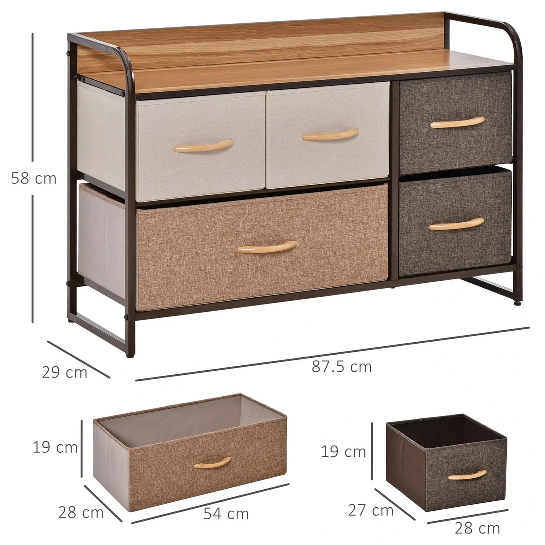 Opt for a soft approach to home storage - go for this fabric drawer unit from HOMCOM. Comes with one large drawer and four small, all in different neutral tones for a stand-out look. The frame, made from metal, ensures a sturdy core structure, with adjustable bottom feet to keep the balance at all times. Finished with wood-effect handles on the drawers to open and close them easily.