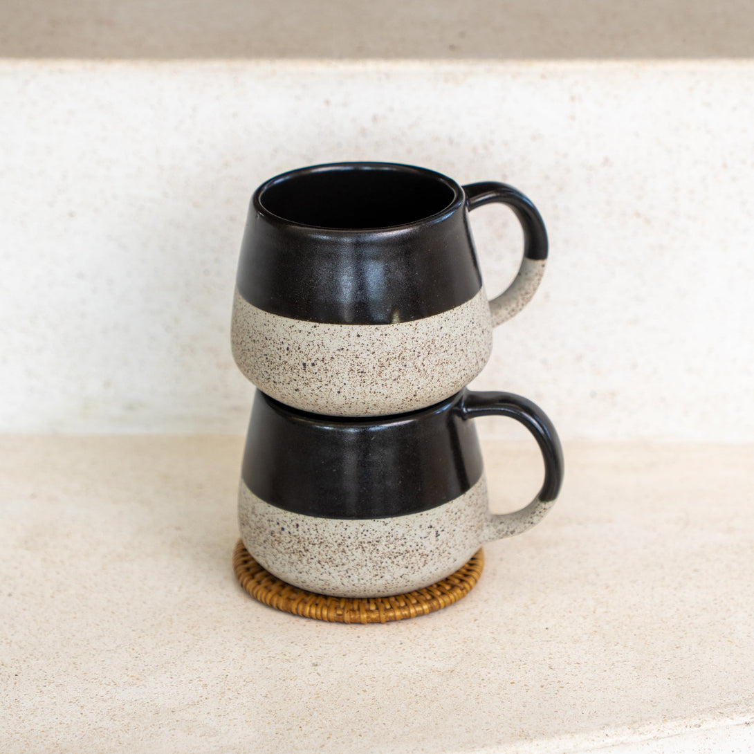 The Dua Mug is handcrafted in Bali by skilled artisans. The mug features a two-tone finish, pairing a deep black glaze with a raw, speckled clay base. The speckling is created by hand, with each flick of the brush leaving its own subtle mark, making every mug unique in character and variation. Made by hand, the slightly tapered shape feels comfortable to hold and stacks neatly when not in use. A clean, modern piece designed for everyday coffee or tea.