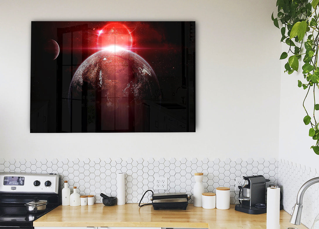 Earth Red Sunrise From Space acrylic print, UV printed onto 5mm thick acrylic glass. Comes with everything you need to hang on your wall.