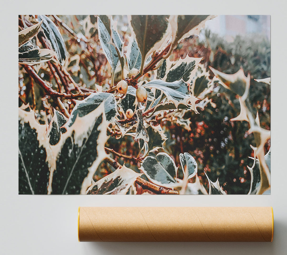Our Emerald Holly Dewdrops Poster is printed 260 GSM premium lustre paper that offers vibrant colours and exceptional detail.