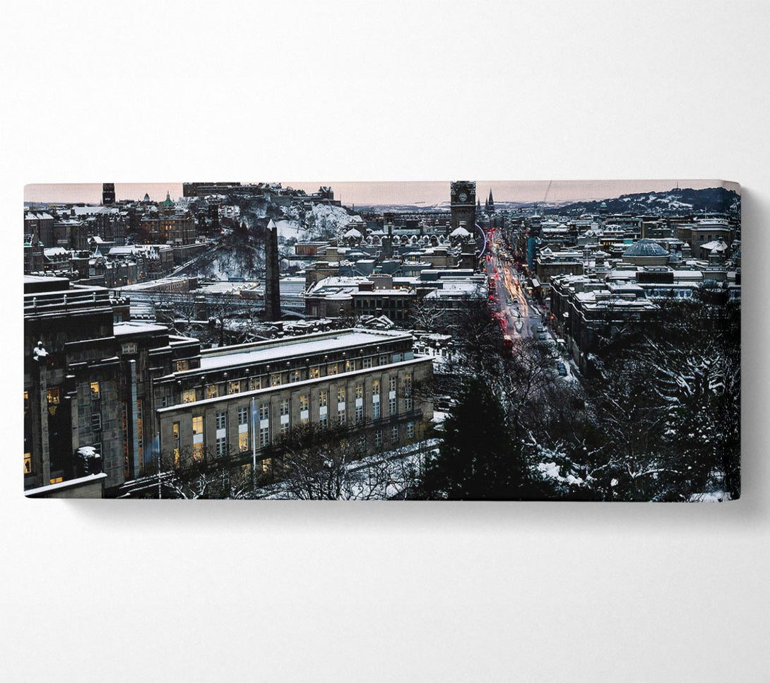 Evening In Edinburgh canvas, printed on coated polyester canvas. Mounted on to a 44mm box frame, ready to hang.