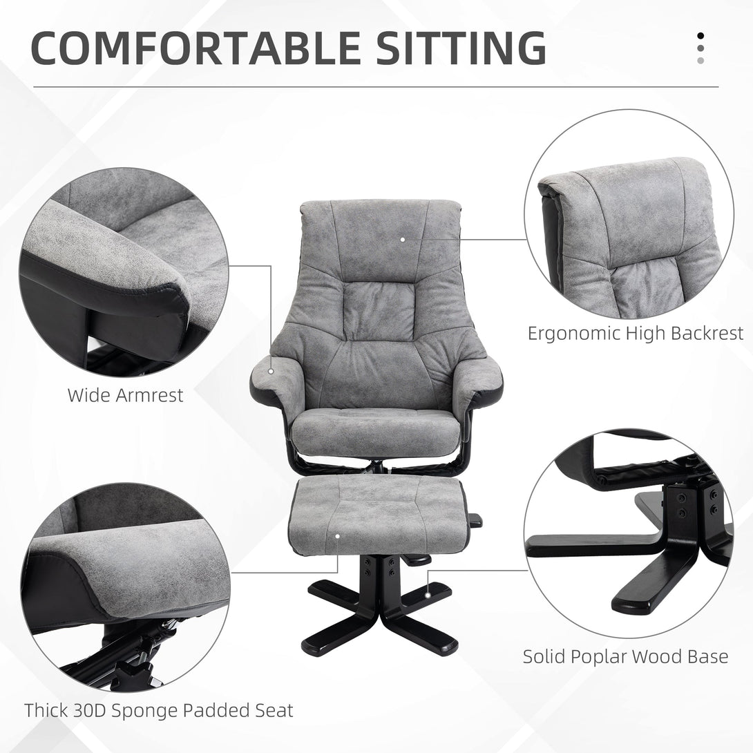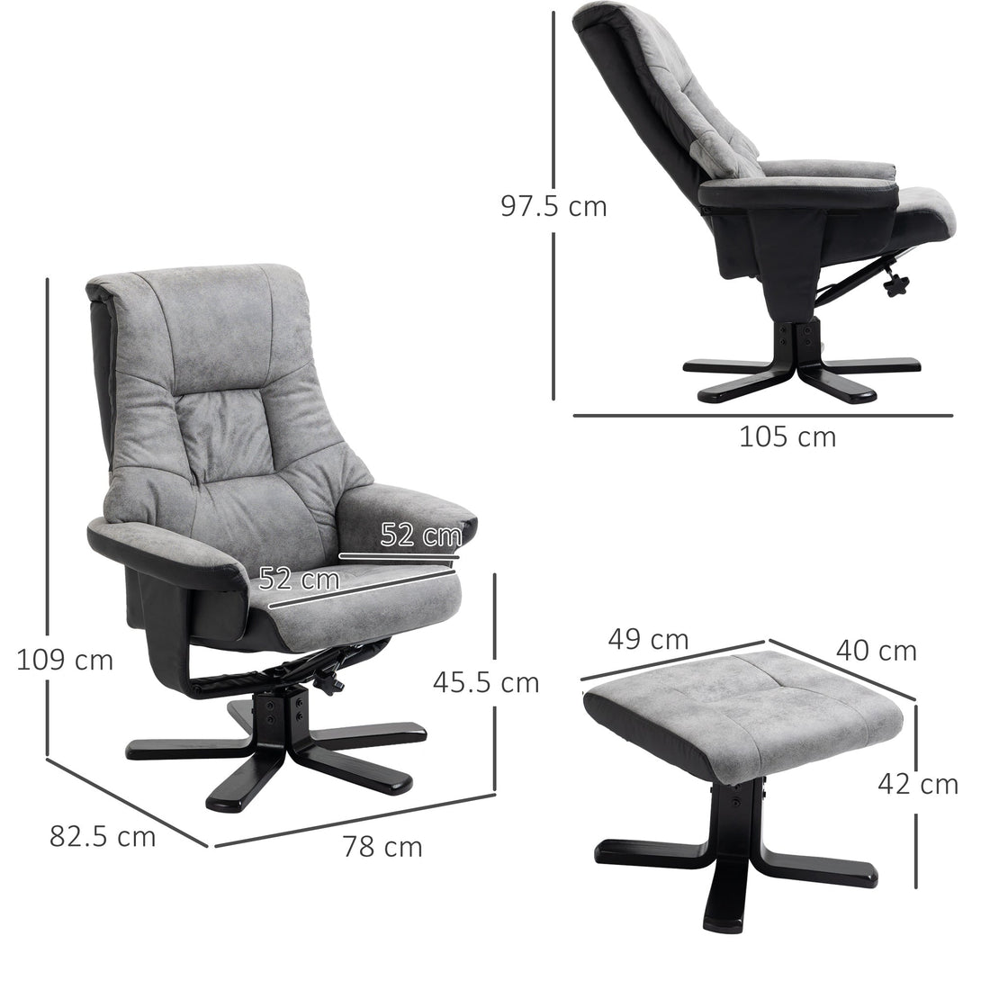 Sink into double the comfort with armchair and footstool duo from HOMCOM. Shaped into a large size, the swivel recliner chair is covered in thick foam padding for comfort, with breathable micro fiber upholstery, in a vintage looked finish for a cool and timeless look. This swivel chair can recline back to a maximum 135° angle via the under-seat handle, making it perfect paired with the footstool.The perfect spot for your afternoon time-outs.