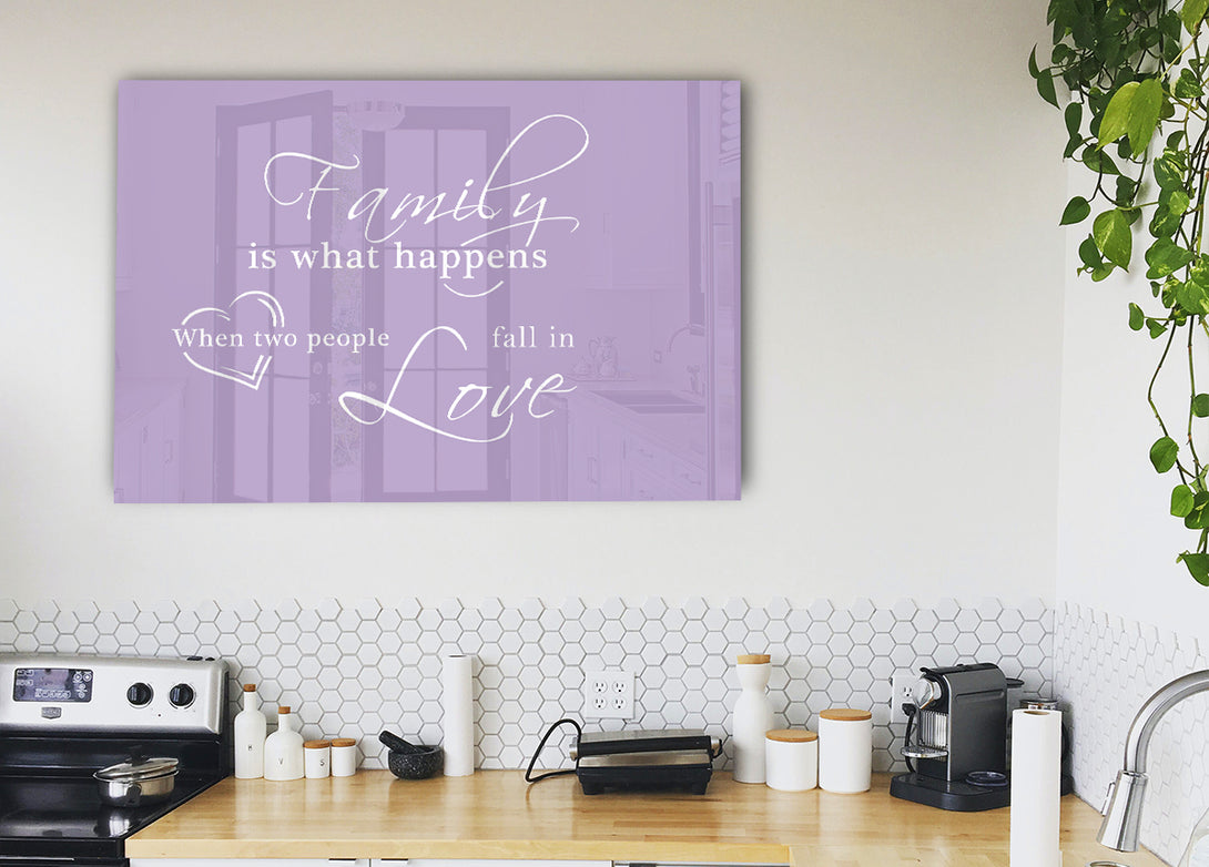 Family Is What Happens Lilac acrylic print, UV printed onto 5mm thick acrylic glass. Comes with everything you need to hang on your wall.