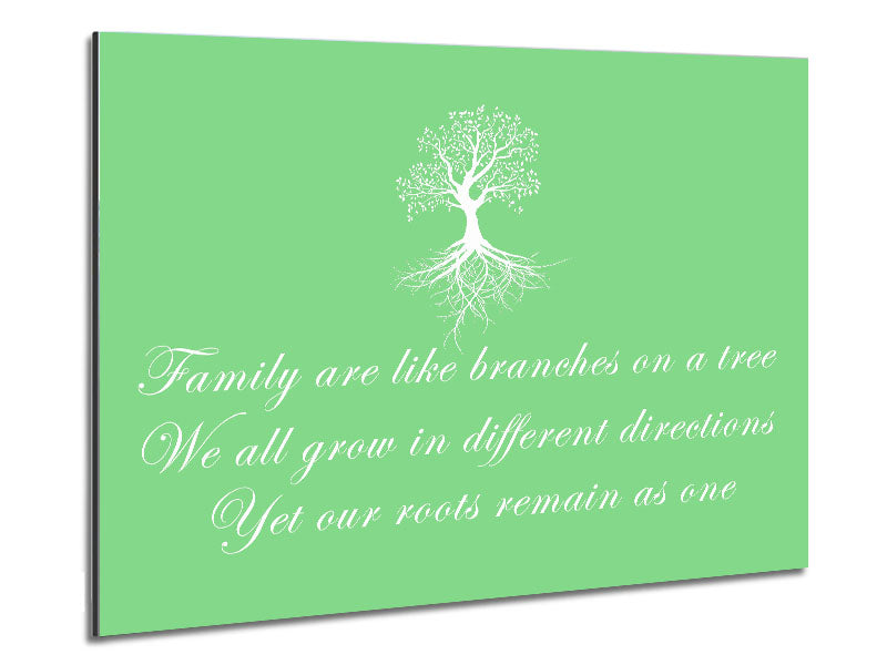 Family Quote Family Are Like Branches Green Printed on brushed aluminium dibond. A modern way to display art and easy to maintain.
