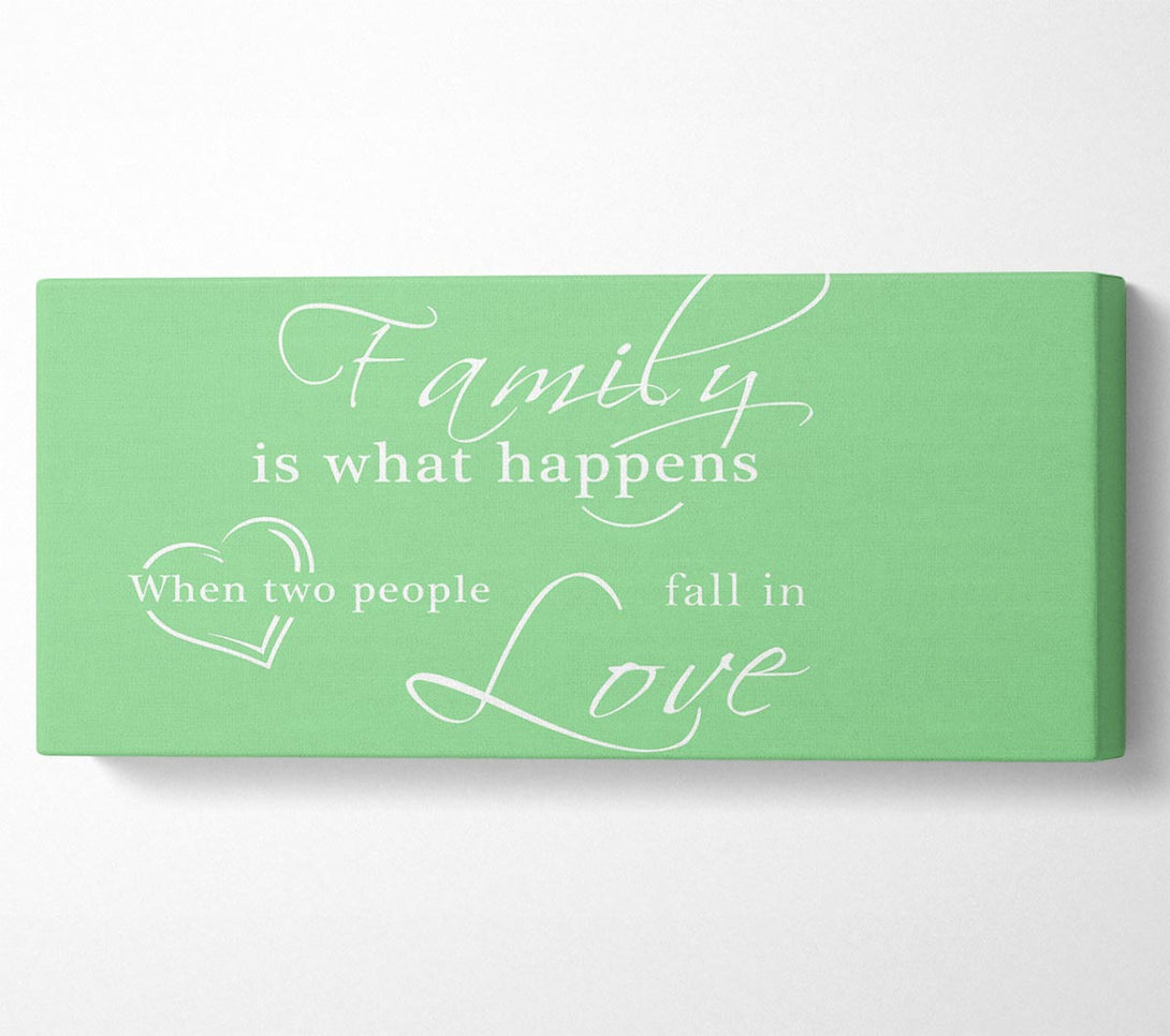 Family Quote Family Is What Happens Green canvas, printed on coated polyester canvas. Mounted on to a 44mm box frame, ready to hang.