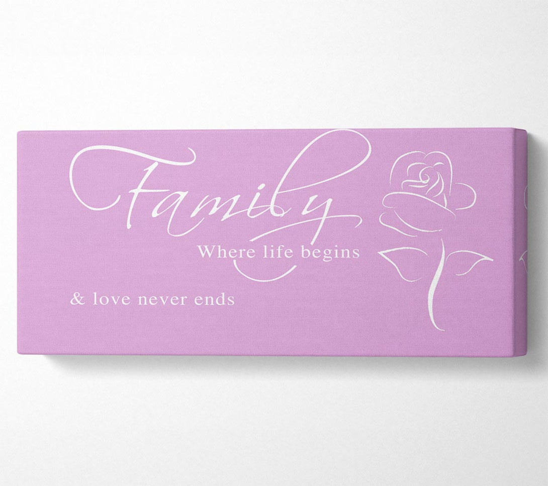 Family Quote Family Where Life Begins 1 Pink canvas, printed on coated polyester canvas. Mounted on to a 44mm box frame, ready to hang.