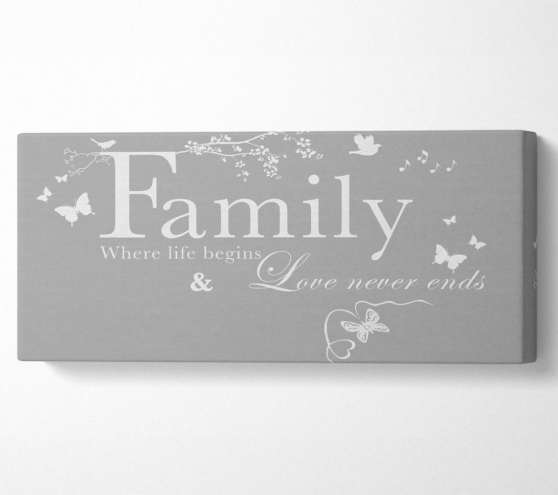 Picture of Family Quote Family Where Life Begins Grey White Panoramic Canvas Wall Art