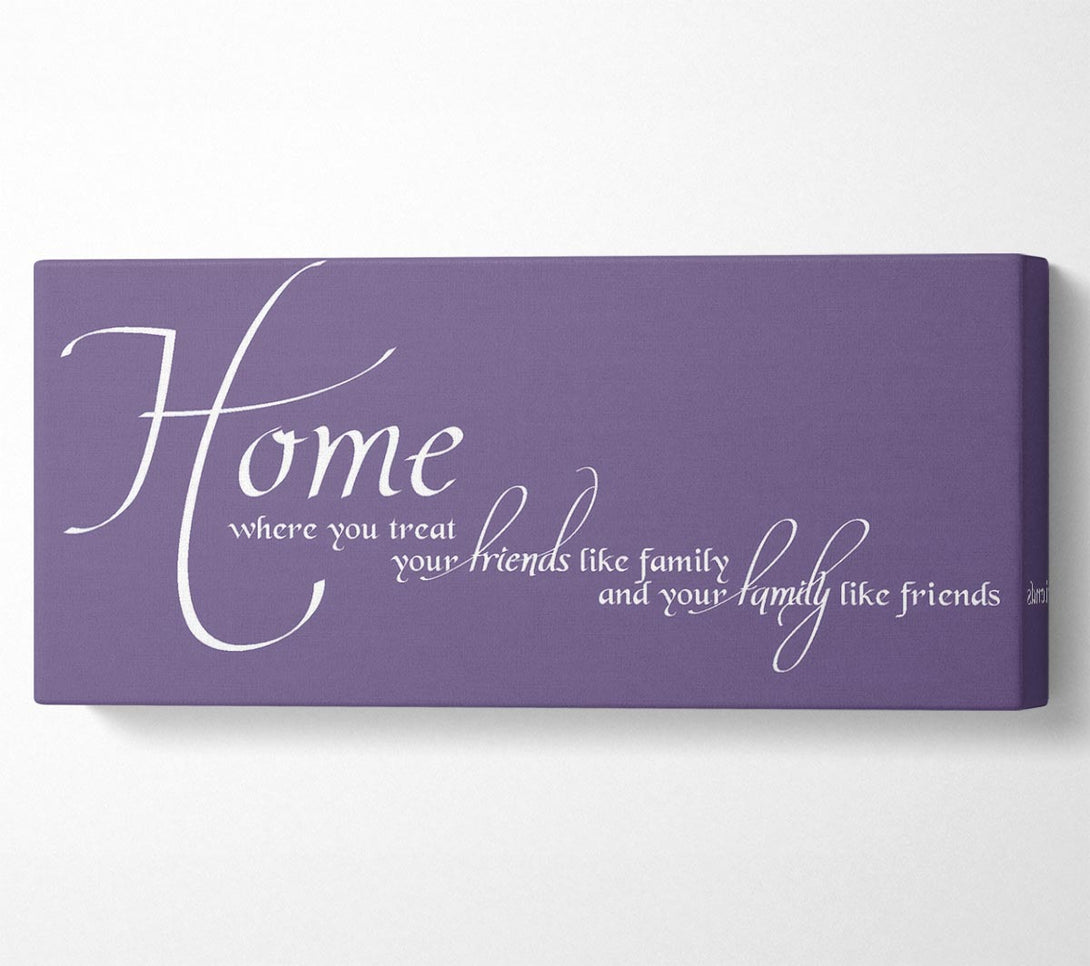 Family Quote Home Family Friends Lilac canvas, printed on coated polyester canvas. Mounted on to a 44mm box frame, ready to hang.