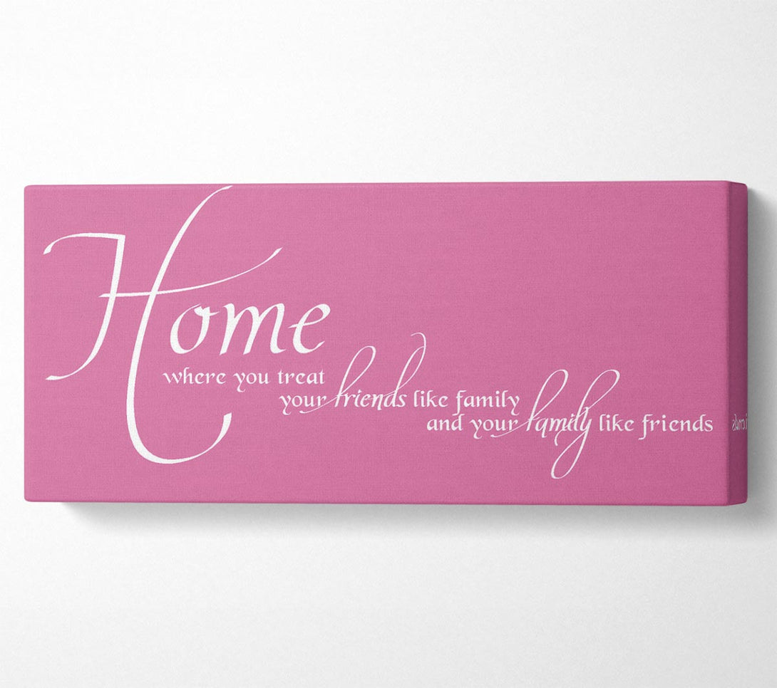 Family Quote Home Family Friends Pink canvas, printed on coated polyester canvas. Mounted on to a 44mm box frame, ready to hang.