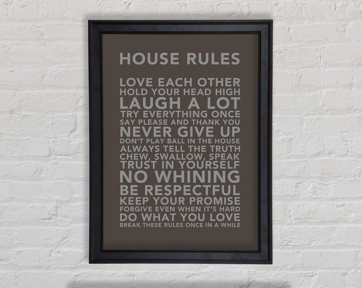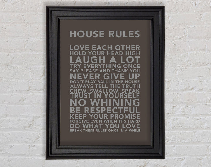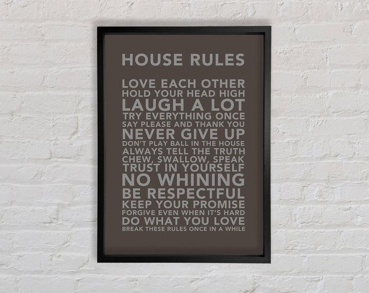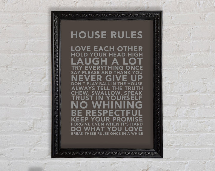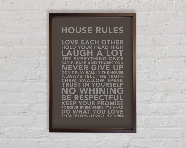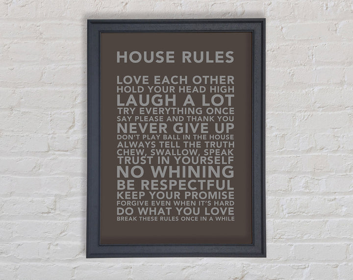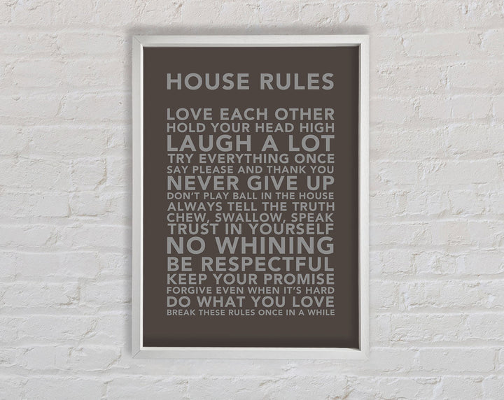 Introducing the Family Quote House Rules 3 Chocolate Framed Print, a delightful piece of framed art designed to add warmth and charm to any home. This beautifully crafted print features inspiring family quotes in a sophisticated chocolate hue, perfect for any room. Available in six different sizes, from small to oversized, it offers flexibility to suit any space. Choose from a variety of colours to match your décor. Each piece is handmade with care in the United Kingdom, ensuring high quality and attention to detail. Ready to hang, this framed art makes it easy to instantly enhance your living space with meaningful words and stylish design.