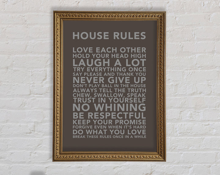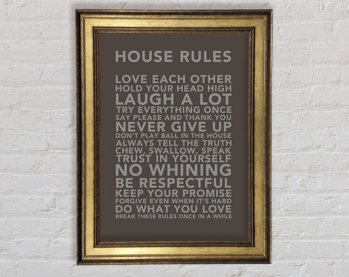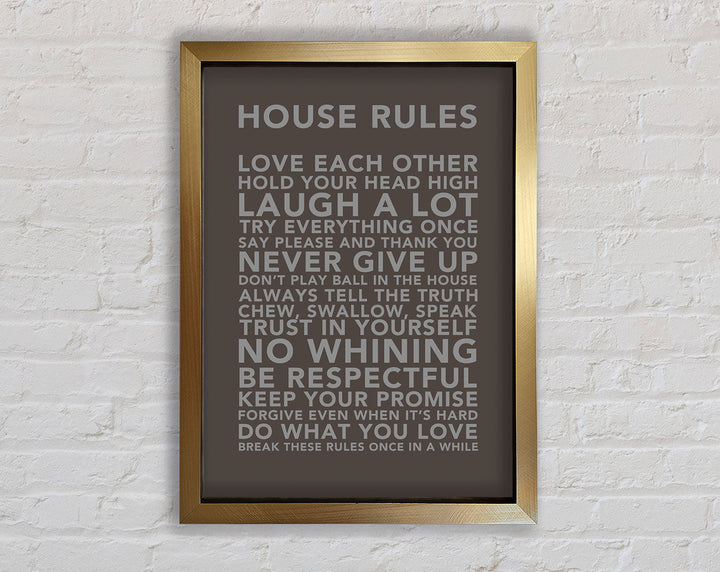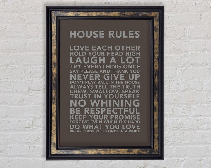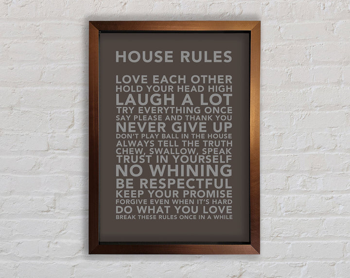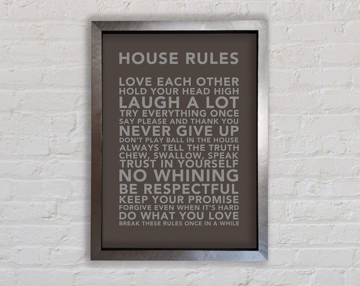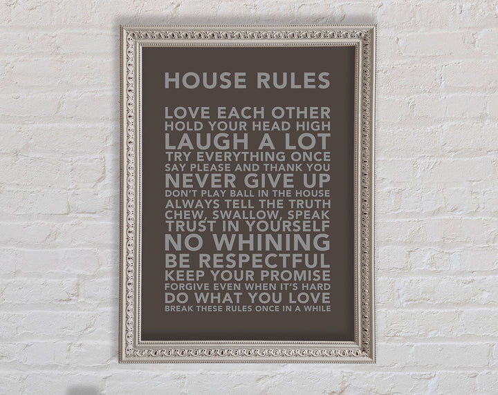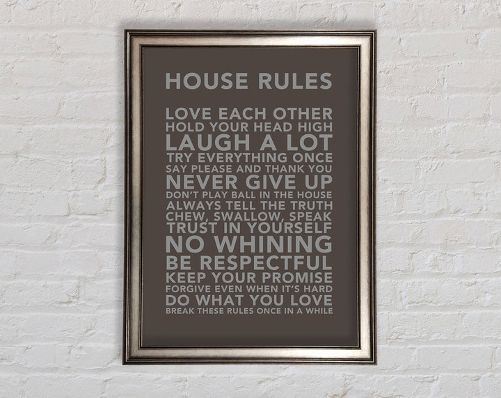 Introducing the Family Quote House Rules 3 Chocolate Framed Print, a delightful piece of framed art designed to add warmth and charm to any home. This beautifully crafted print features inspiring family quotes in a sophisticated chocolate hue, perfect for any room. Available in six different sizes, from small to oversized, it offers flexibility to suit any space. Choose from a variety of colours to match your décor. Each piece is handmade with care in the United Kingdom, ensuring high quality and attention to detail. Ready to hang, this framed art makes it easy to instantly enhance your living space with meaningful words and stylish design.