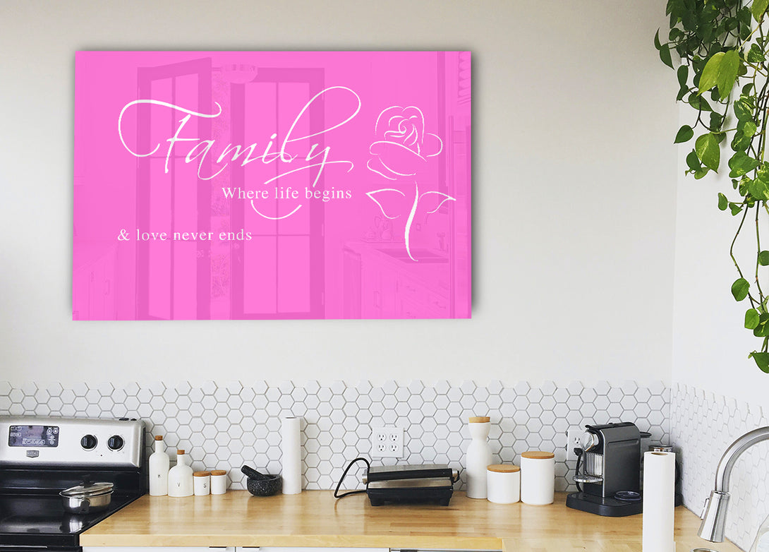Family Where Life Begins 1 Vivid Pink acrylic print, UV printed onto 5mm thick acrylic glass. Comes with everything you need to hang on your wall.