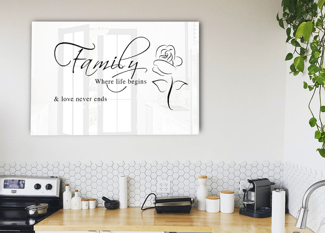 Family Where Life Begins 1 White acrylic print, UV printed onto 5mm thick acrylic glass. Comes with everything you need to hang on your wall.