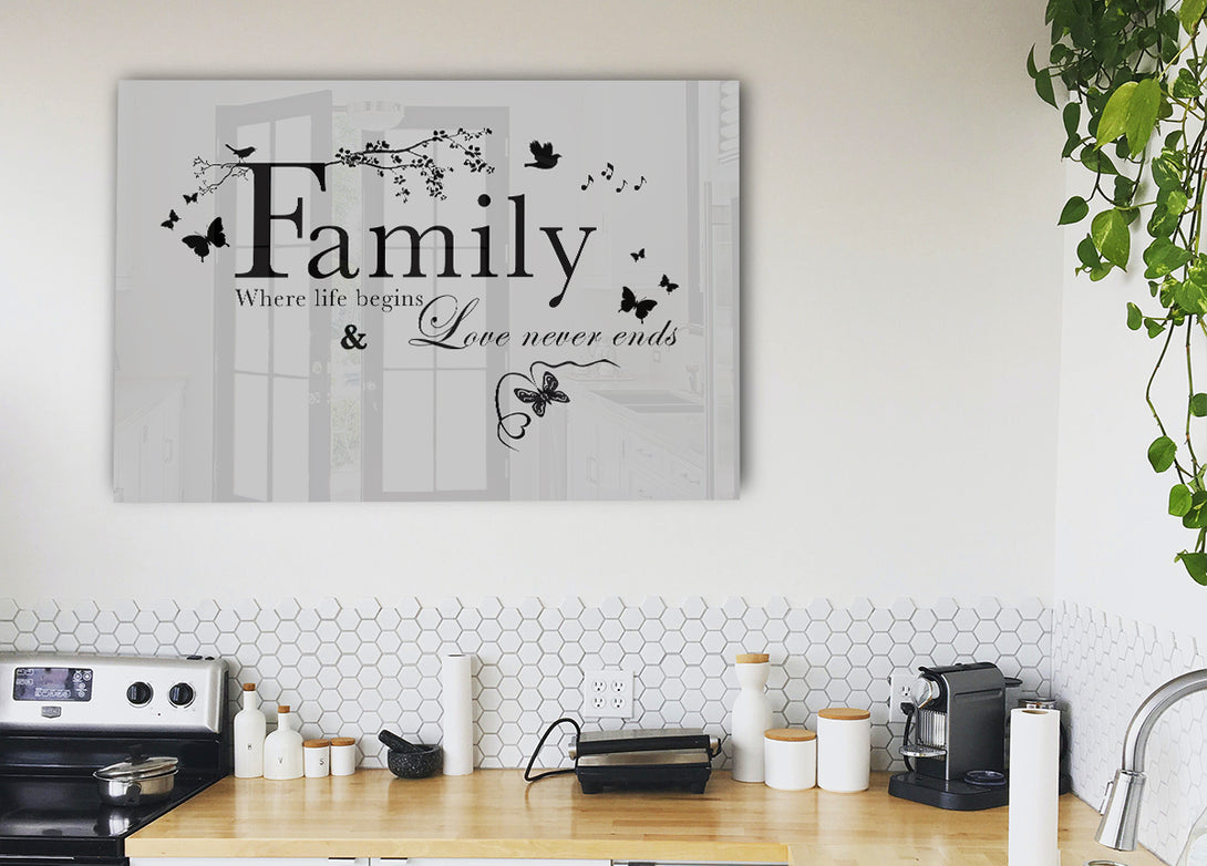Family Where Life Begins Grey acrylic print, UV printed onto 5mm thick acrylic glass. Comes with everything you need to hang on your wall.