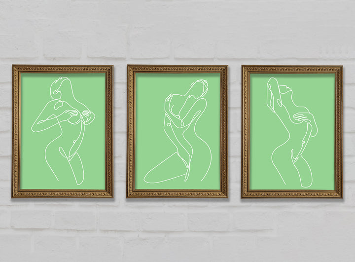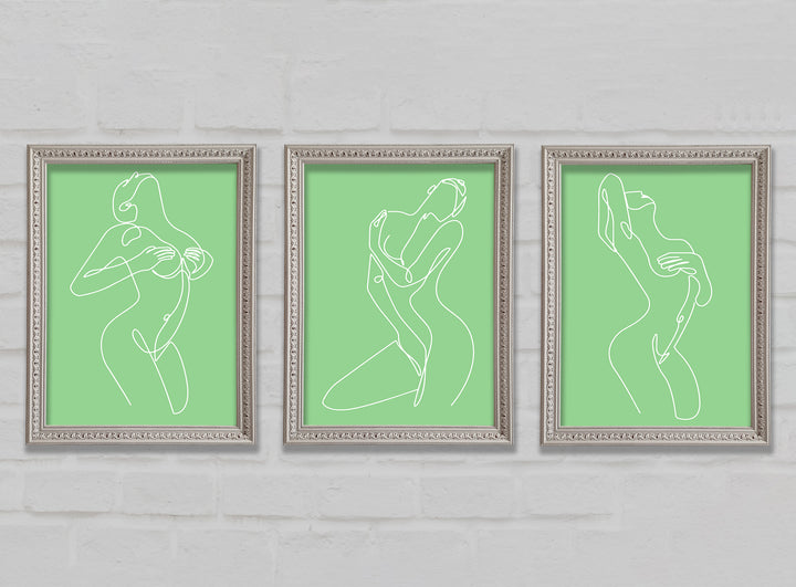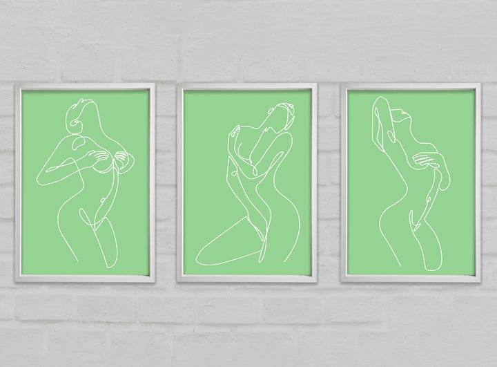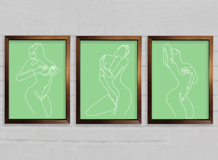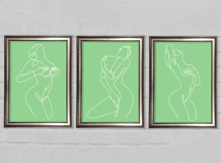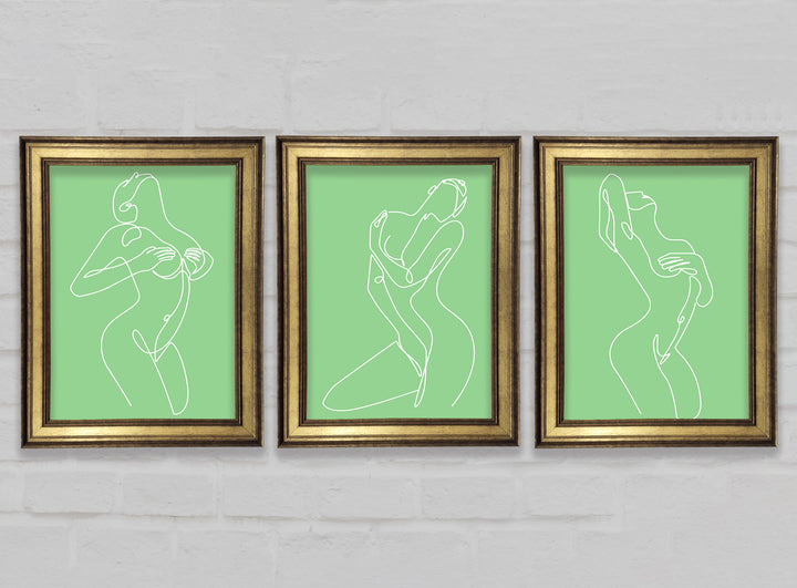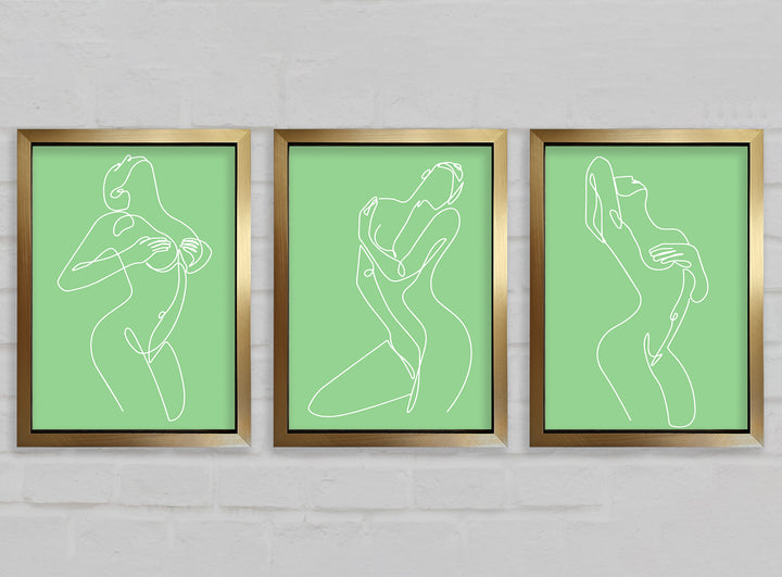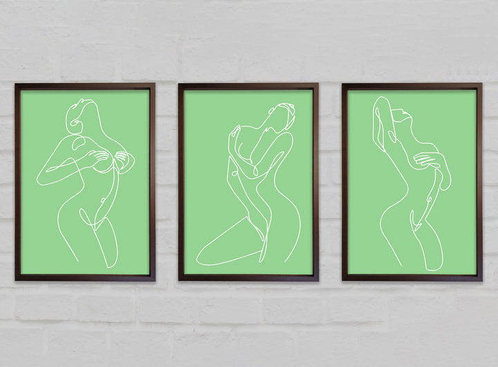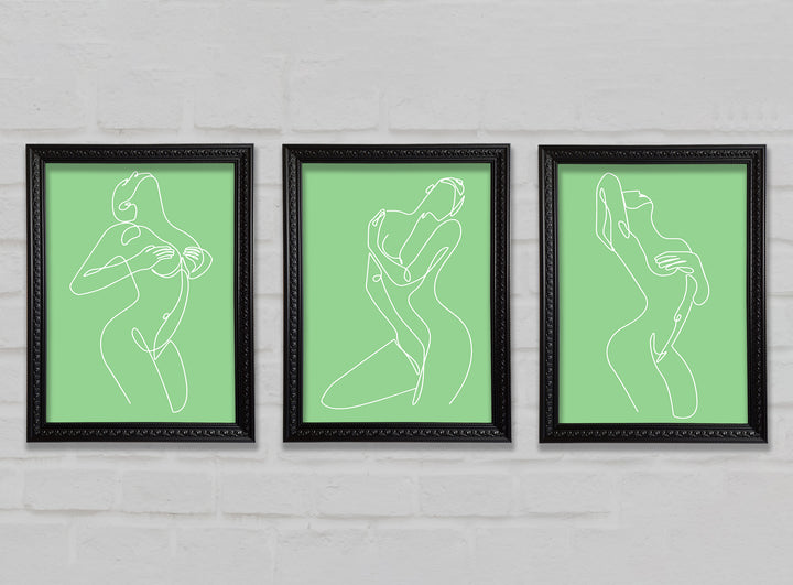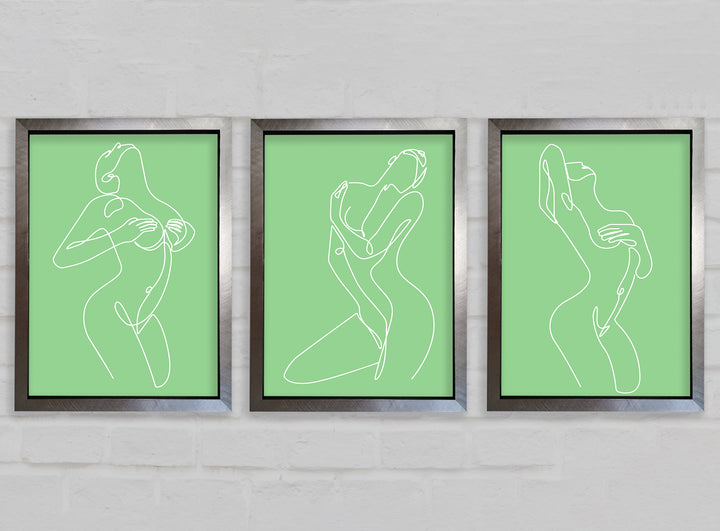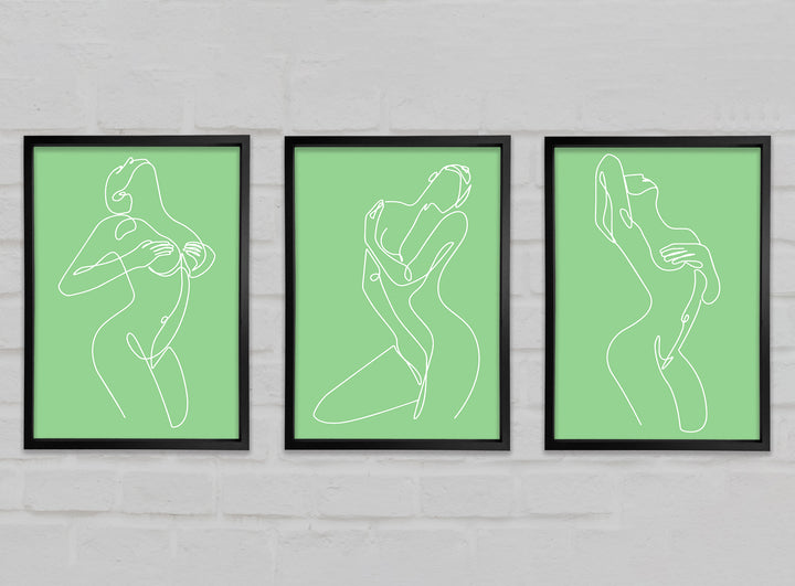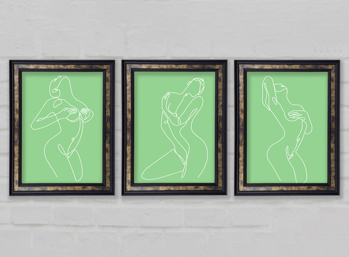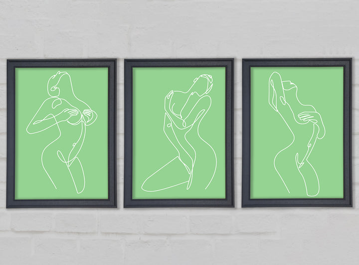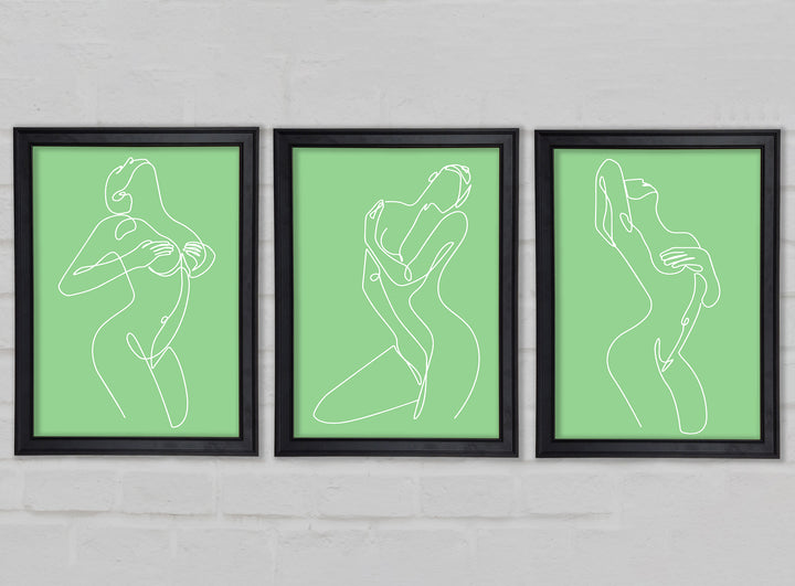 Fashion Line Art Green set of 3 framed print wall art, available in mutiple frame colours. Ready to hang from the box and handmade in the United Kingdom.