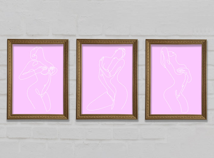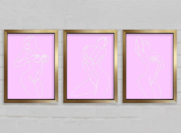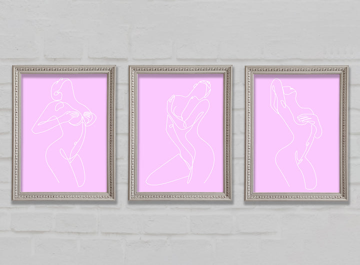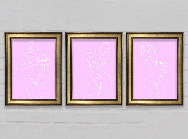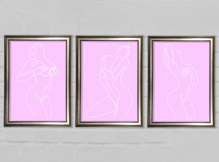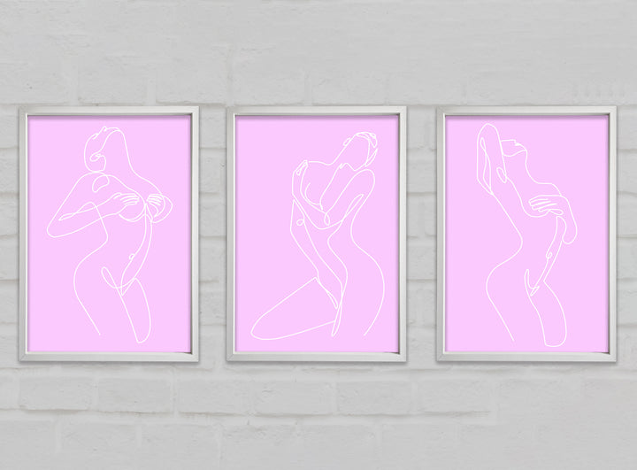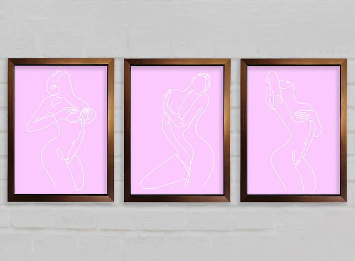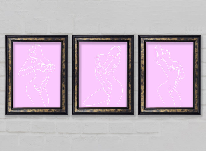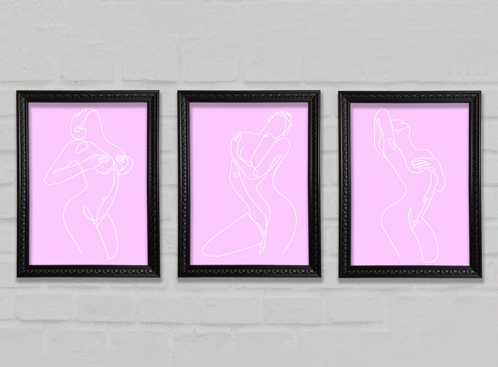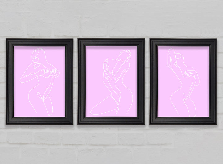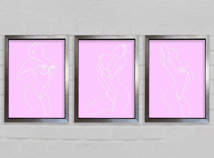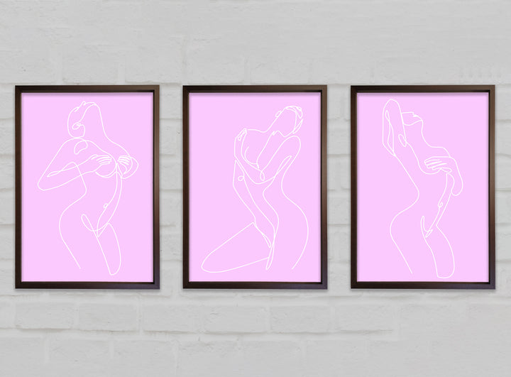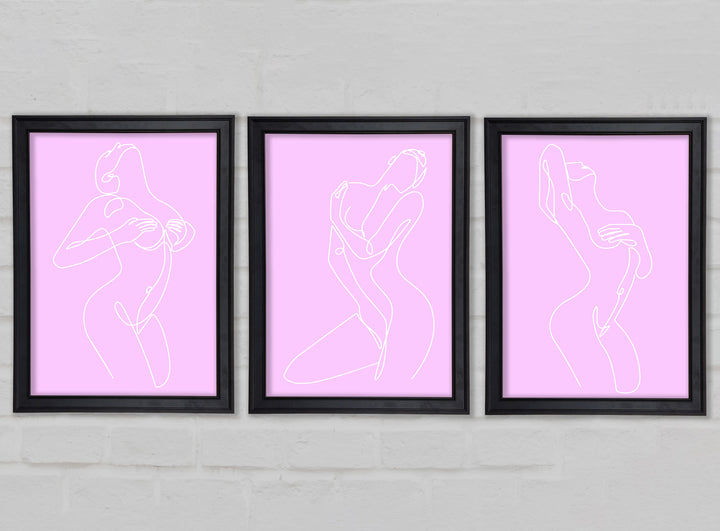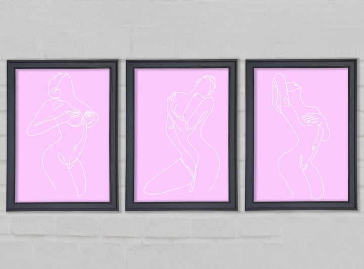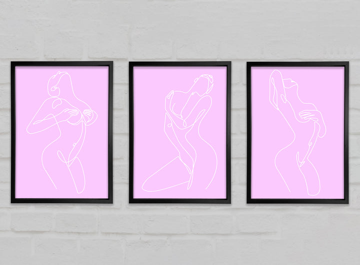 Fashion line Art Pink And White set of 3 framed print wall art, available in mutiple frame colours. Ready to hang from the box and handmade in the United Kingdom.