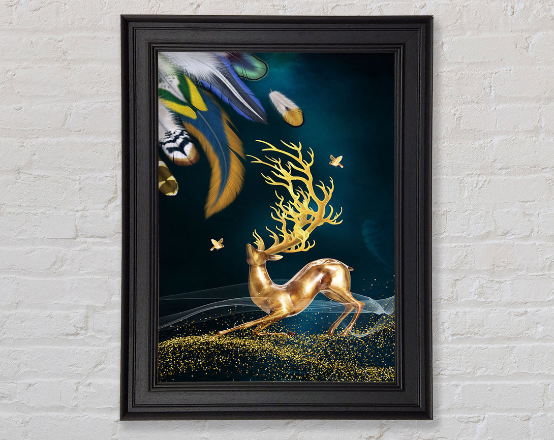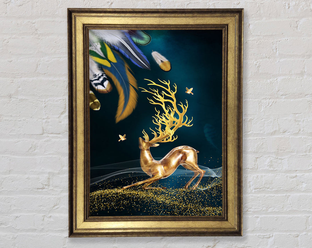 Feathers And Gold Reindeer Framed Print