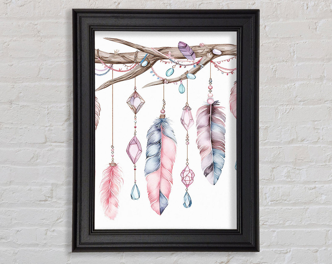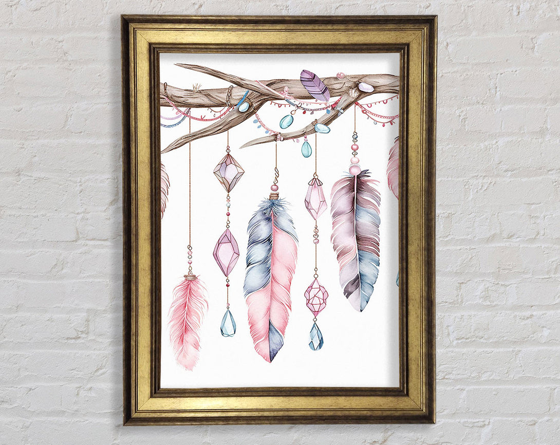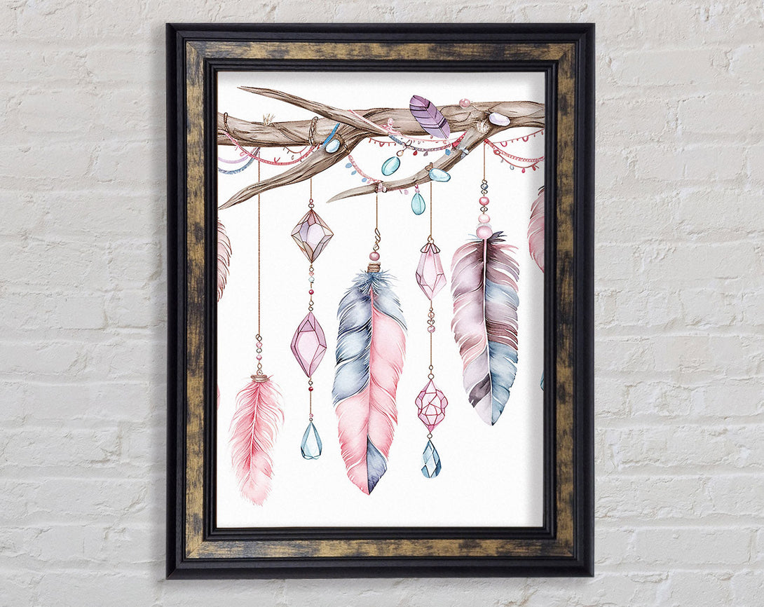 Feathers And Jewels Hanging From A Branch Framed Print