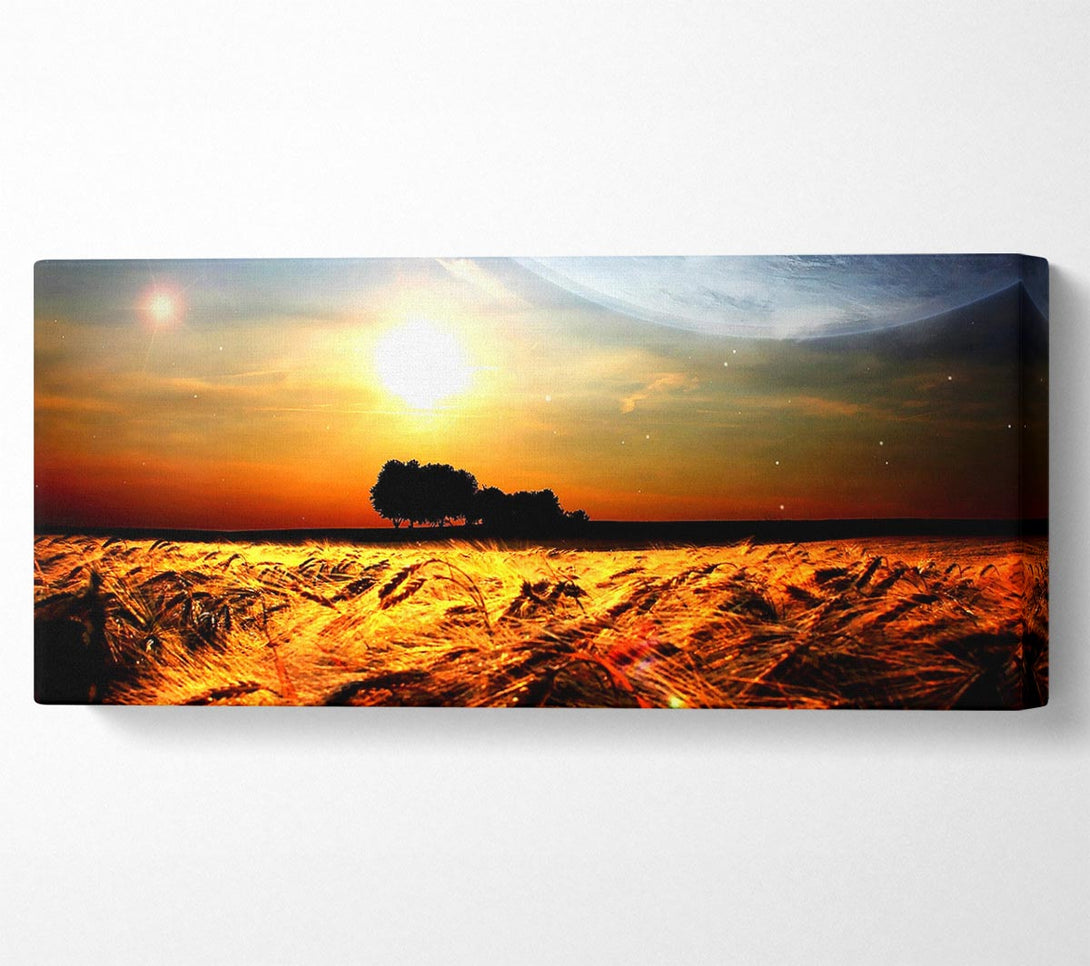 Fields Wheat In The Planets Golden Sun canvas, printed on coated polyester canvas. Mounted on to a 44mm box frame, ready to hang.