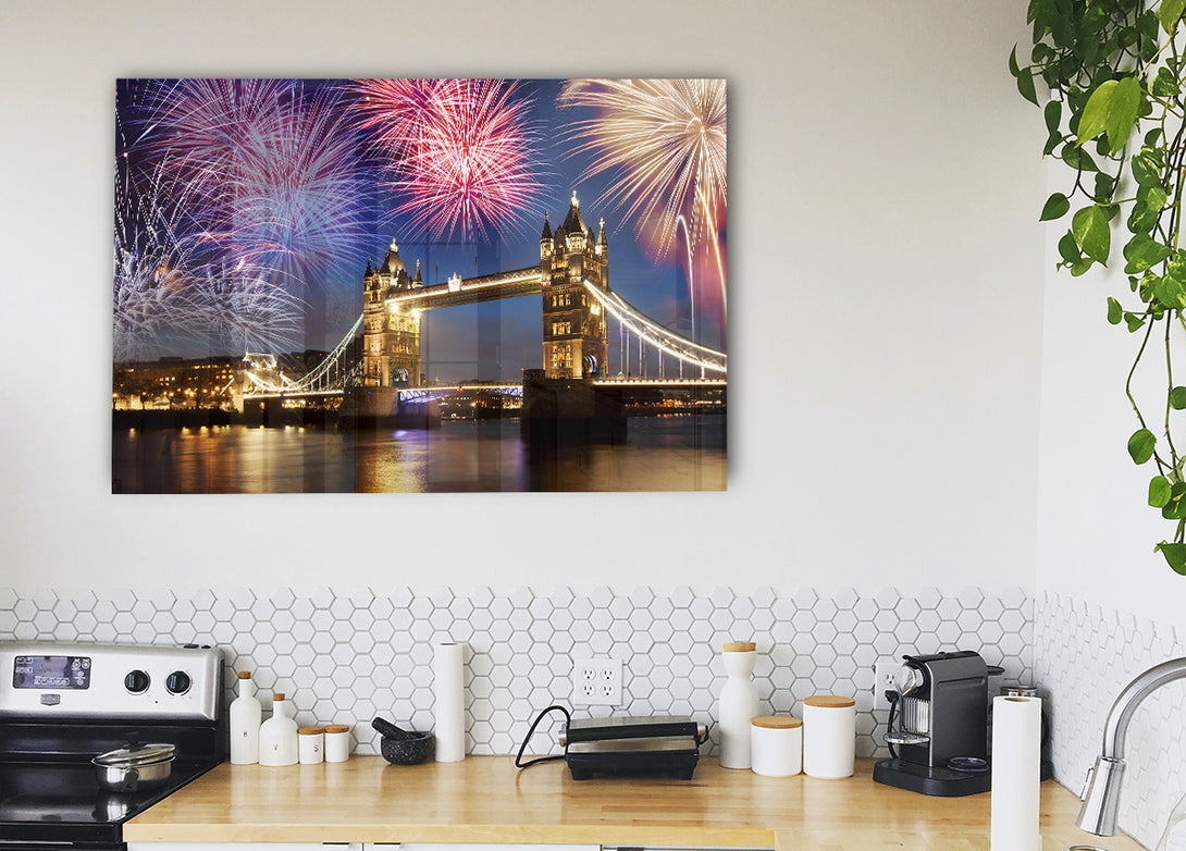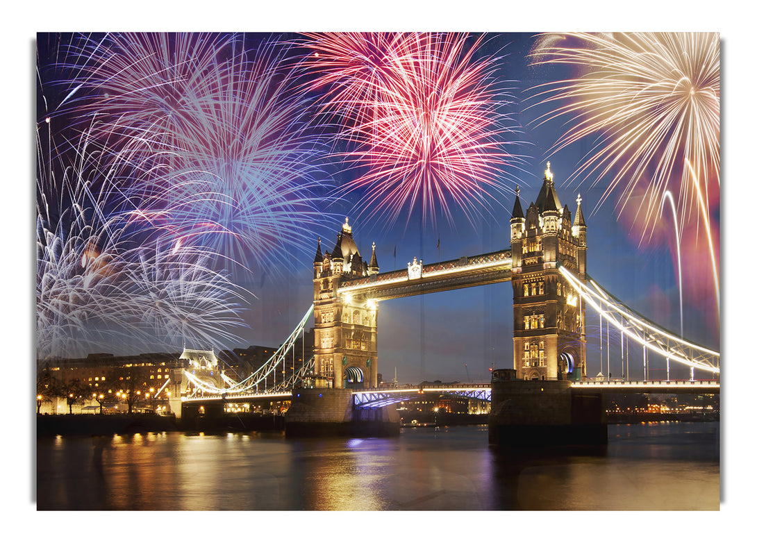 Fireworks Over Tower Bridge acrylic print, UV printed onto 5mm thick acrylic glass. Comes with everything you need to hang on your wall.