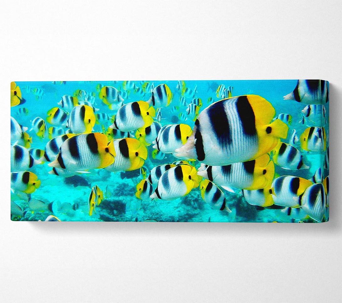 Fish Fury canvas, printed on coated polyester canvas. Mounted on to a 44mm box frame, ready to hang.
