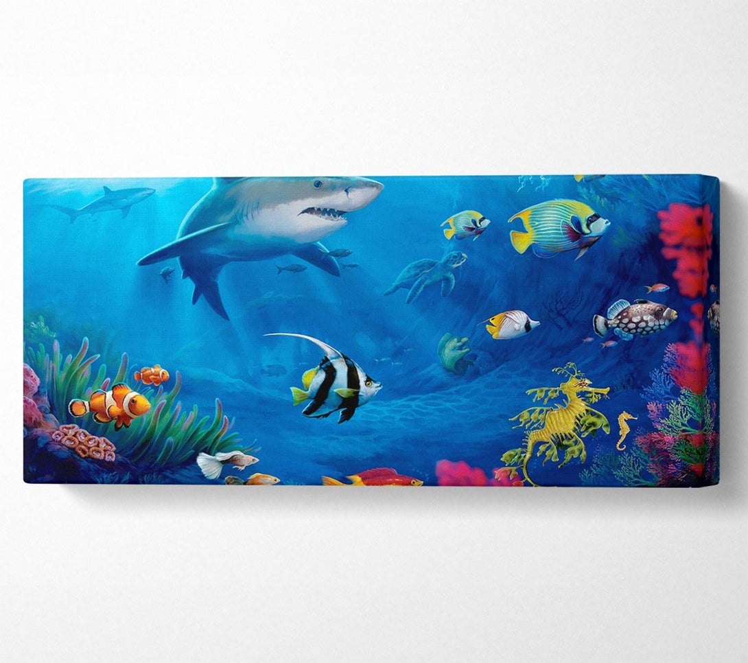 Fish Swirl Ocean canvas, printed on coated polyester canvas. Mounted on to a 44mm box frame, ready to hang.