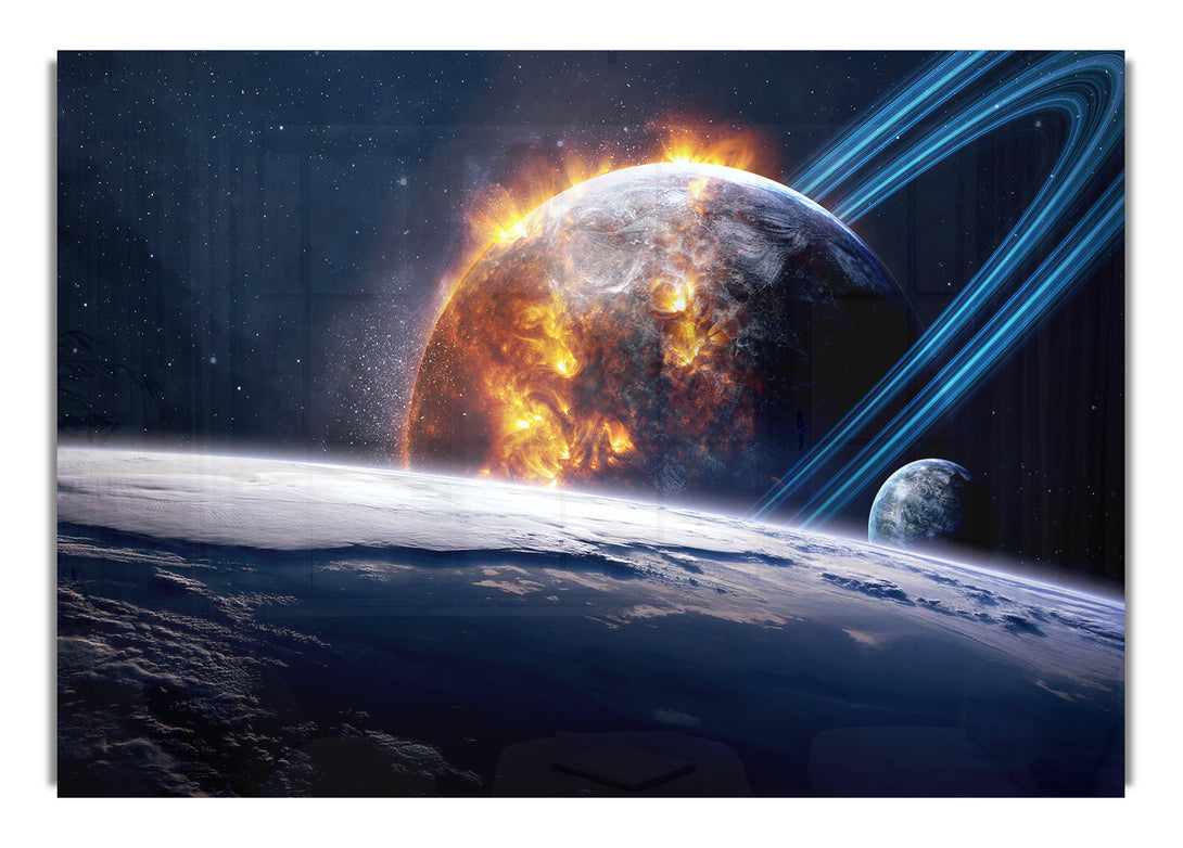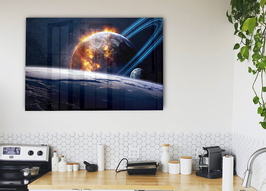 Flaming Sun Above The Earth acrylic print, UV printed onto 5mm thick acrylic glass. Comes with everything you need to hang on your wall.