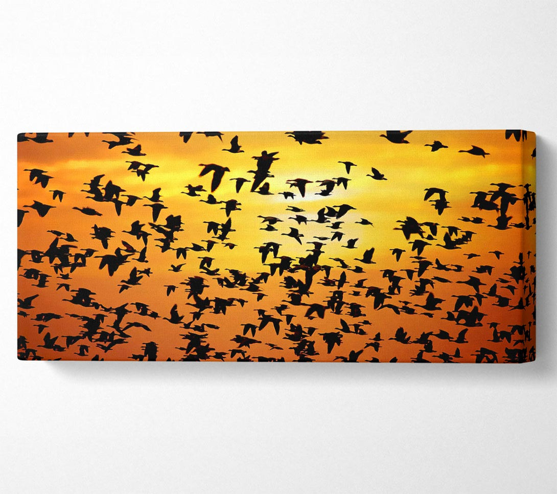 Flight Of The Golden Birds canvas, printed on coated polyester canvas. Mounted on to a 44mm box frame, ready to hang.