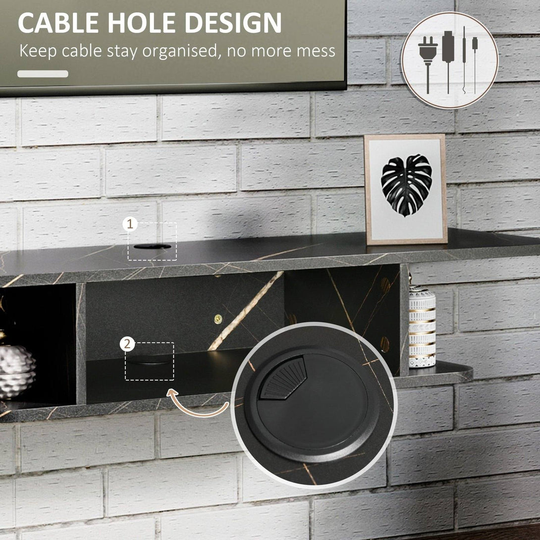 Make your space modern with this floating TV shelf, from HOMCOM. The wall-mounted design means no floor space is taken, with cable holes on the back to keep wires together and mess-free. Made from particle board, this unit is durable, with a protective melamine coating. It has a spacious middle shelf for storage; the smaller side shelves and table top offer extra display room.