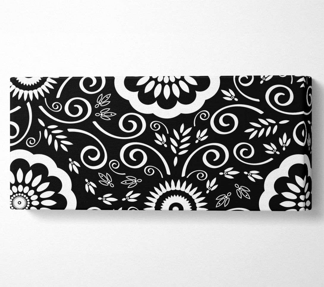 Flock Of Flowers White On Black canvas, printed on coated polyester canvas. Mounted on to a 44mm box frame, ready to hang.