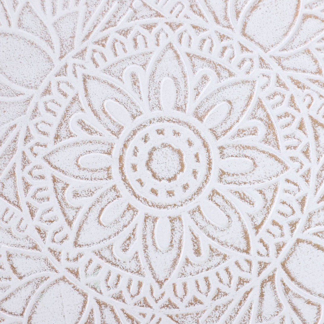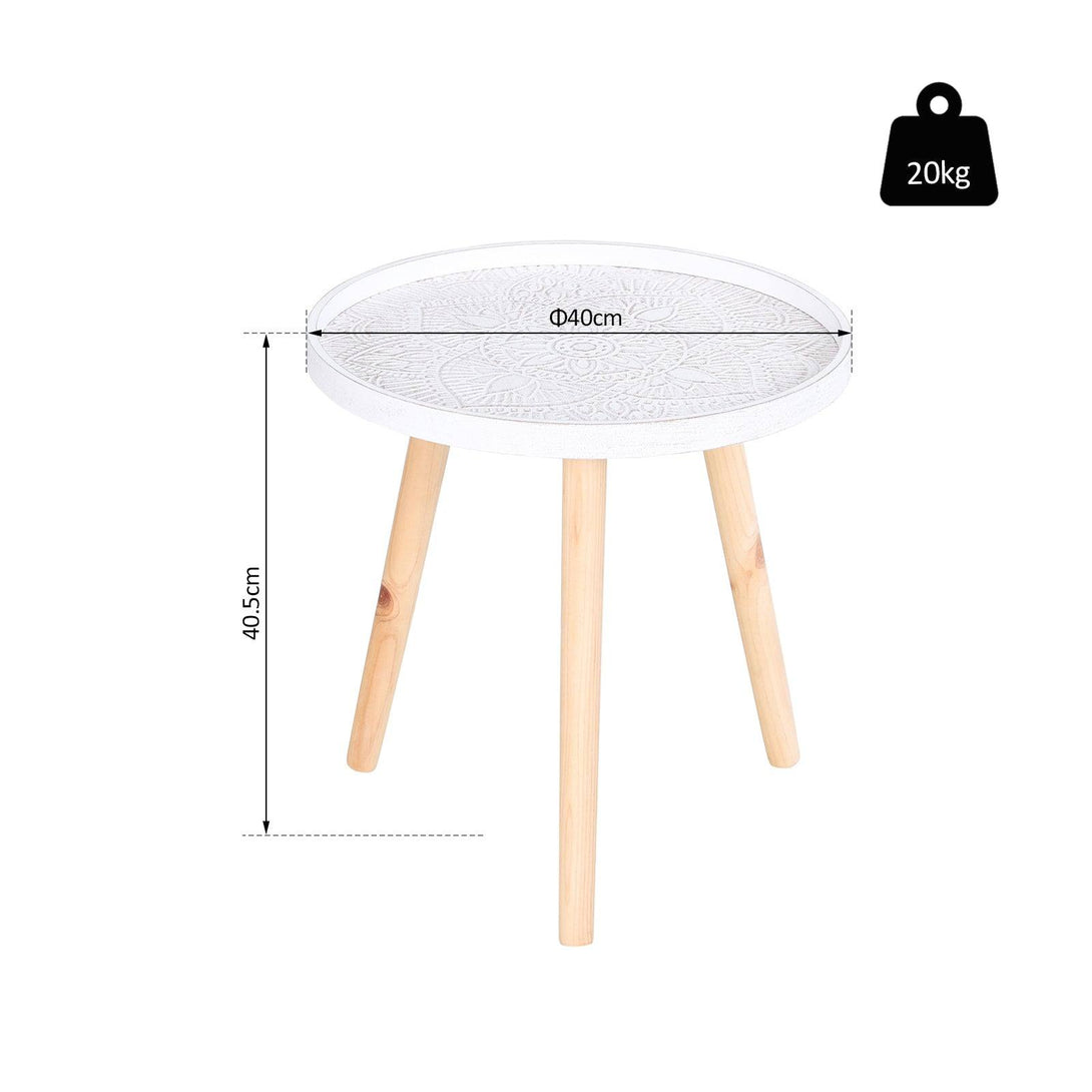 Bring beauty into your everyday surroundings with this side table from HOMCOM. Using MDF for enduring strength and resilience against everyday wear, the tabletop is crafted into a shallow saucer design, with raised edges to prevent anything from falling off and breaking. In a fresh white tone which brightens up your home instantly, the saucer is covered in flower etching all over for an elegant look, with water-resistant paint all over for extra protection. It is finished with three solid wooden legs, providing stability which is able to hold up to 20kg steadily. A beautiful companion for the bedroom, living room, hallway and office.
