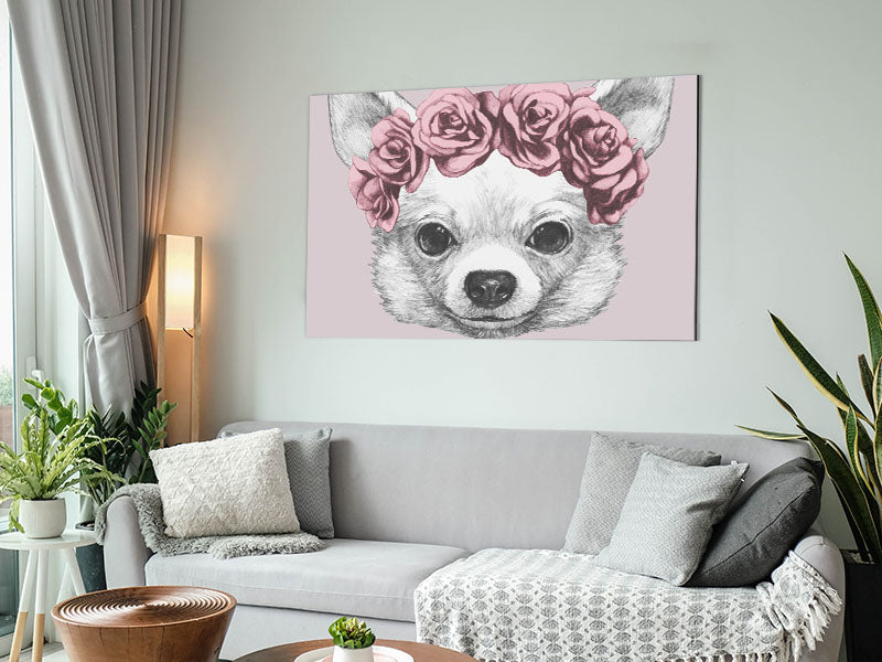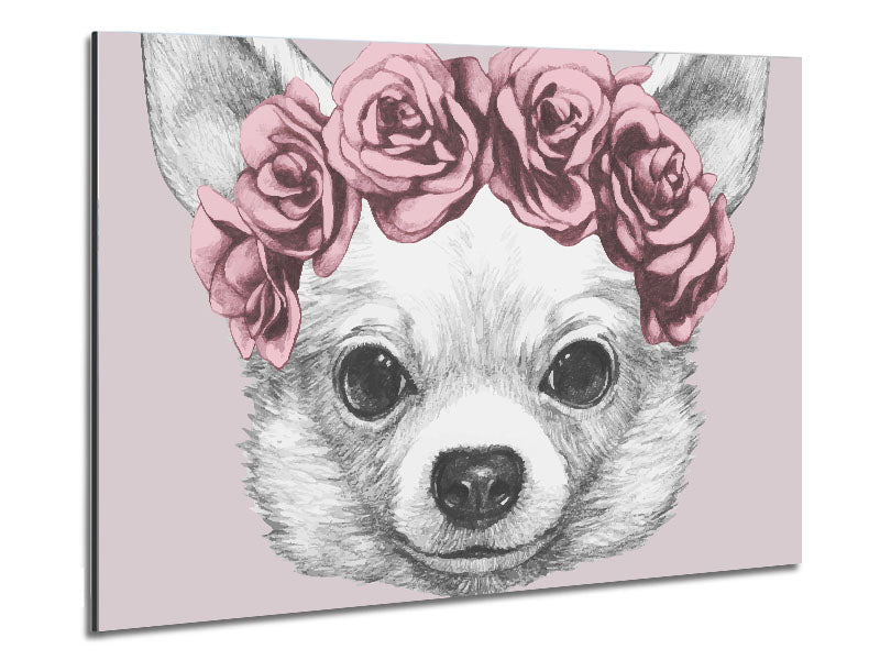 Flower Head Chihuahua Printed on brushed aluminium dibond. A modern way to display art and easy to maintain.