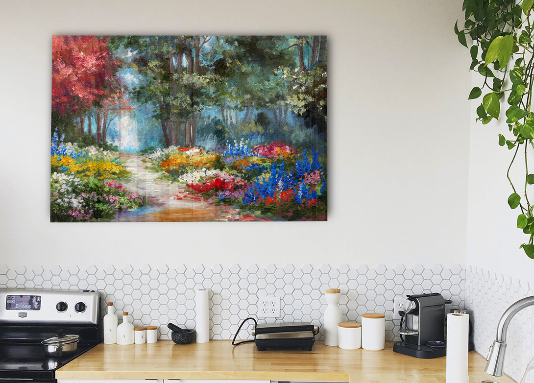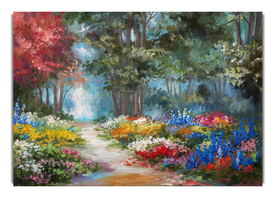 Flowers Leading Into The Forest acrylic print, UV printed onto 5mm thick acrylic glass. Comes with everything you need to hang on your wall.
