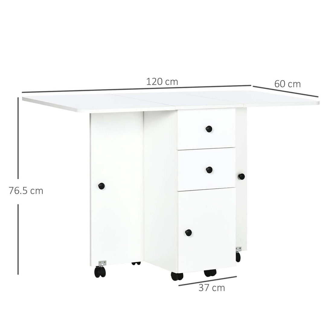 Choose this drop leaf dining table from HOMCOM as a space-saving option when needed. This small folding table has an expandable design where both sides lift to provide additional space with a maximum capacity of 4 to 6 people or can be reduced to a compact size. Two drawers, back shelf and a cabinet that offers discreet storage, while six wheels with four breaks allowing easy movement or staying in a fixed place.
