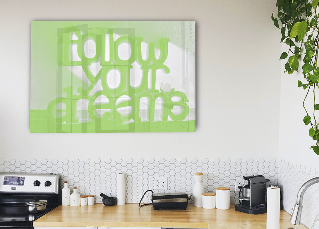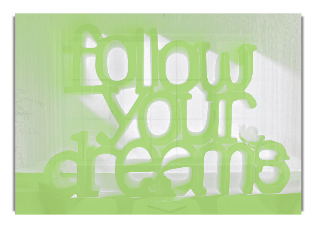 Follow Your Dreams Lime Green acrylic print, UV printed onto 5mm thick acrylic glass. Comes with everything you need to hang on your wall.