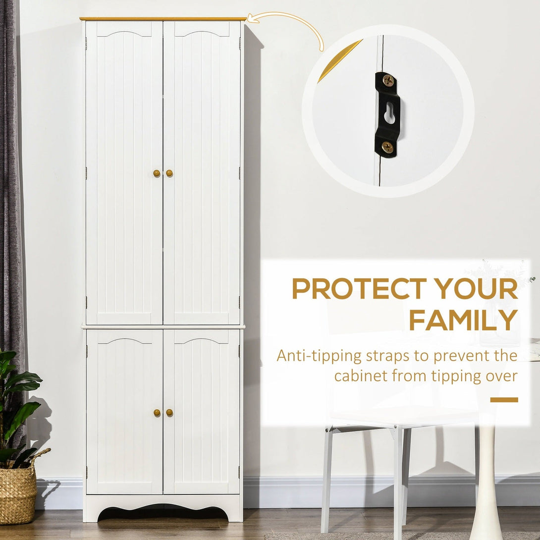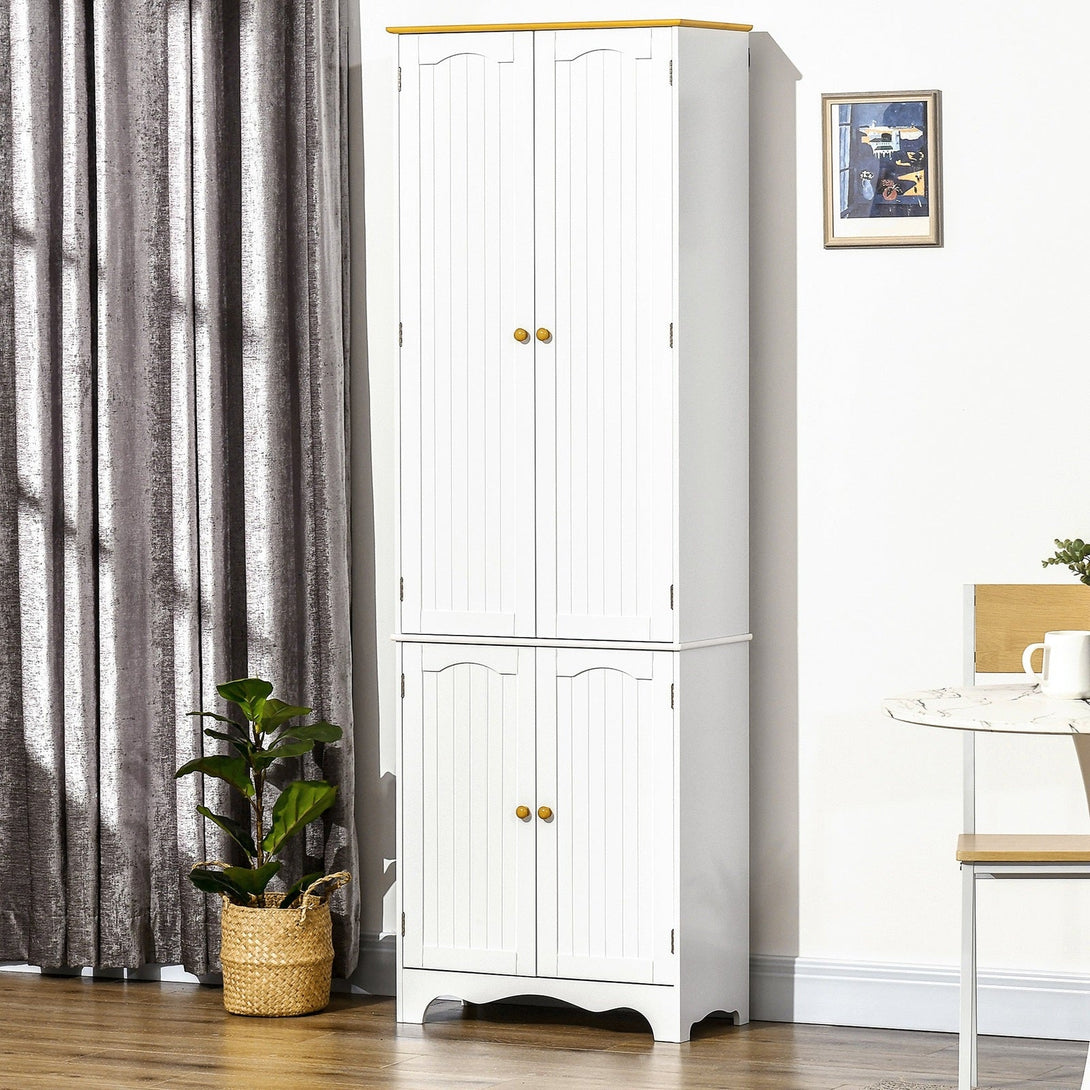 Kitchen running out of space? This HOMCOM tall storage cabinet will help tremendously. It comes with six tiers inside, divided into two sections - plenty of room for keeping all kitchen essentials stored. The white and wood-effect design is classic and versatile - it'll blend itself in beautifully with ease. Now you'll never an untidy kitchen and dining space again.