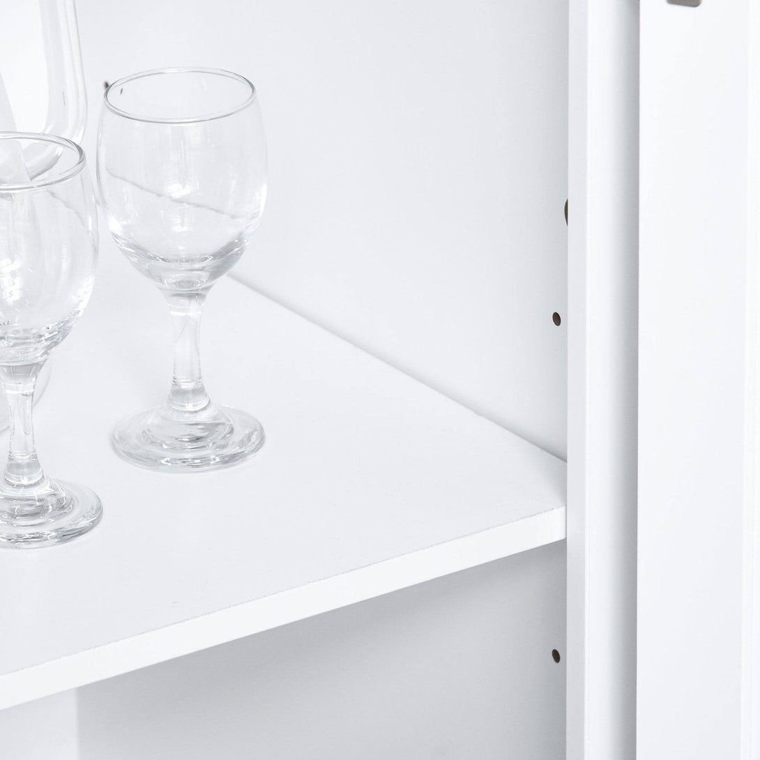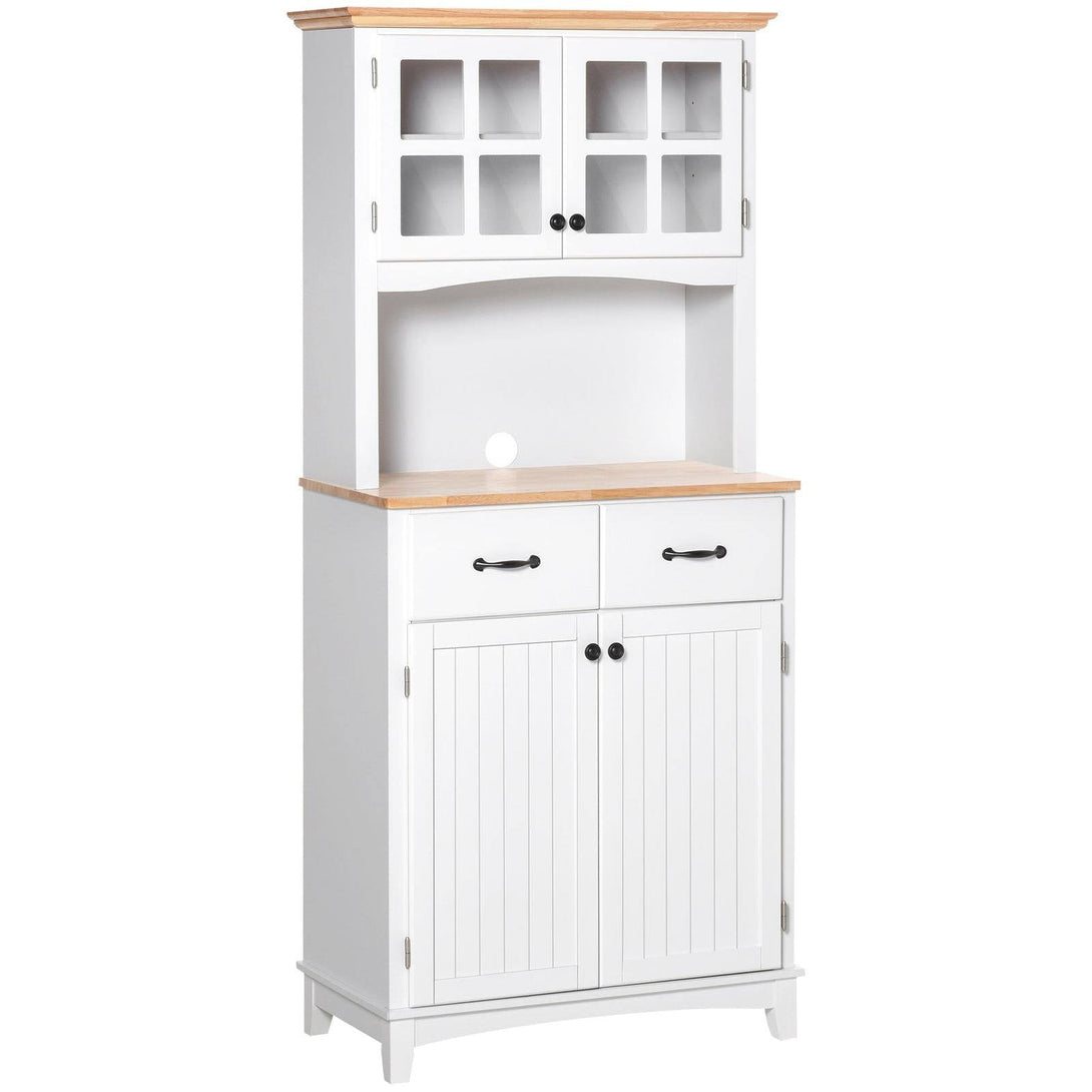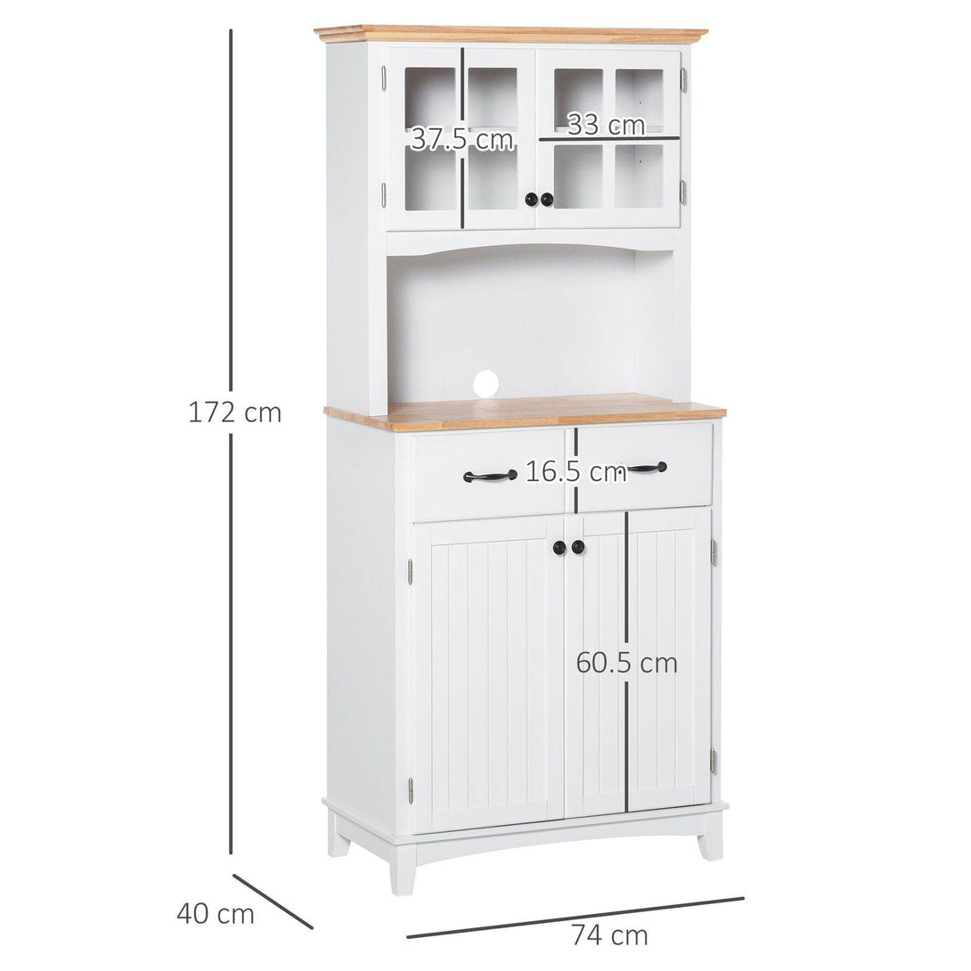 Organize your kitchenware and add more storage space with HOMCOM storage cabinets with doors and shelves. You can use the upper framed glass door cabinet to store plates or display your collections. And the lower cabinet for bigger items such as coffee machine, toaster and wines. Middle drawers can be used to put forks, knives and napkins. And the rubber wood table top offers you a spacious area to place your microwave oven, coffee machine with cable management system.