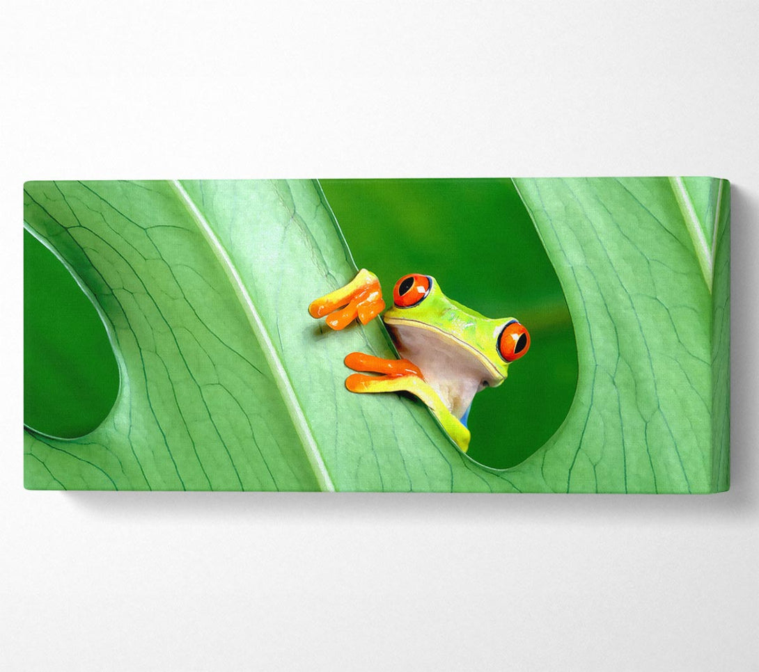 Frog canvas, printed on coated polyester canvas. Mounted on to a 44mm box frame, ready to hang.