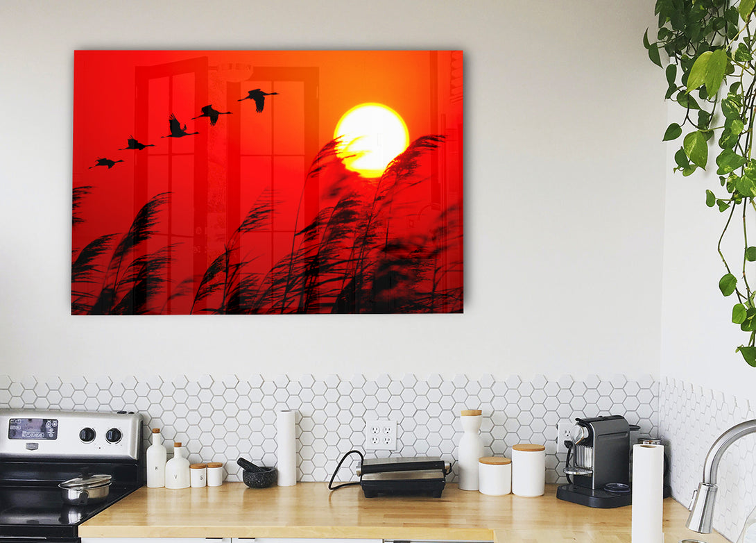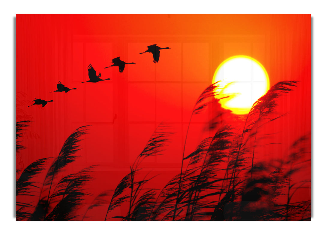Geese In Flight Under The Red Sun acrylic print, UV printed onto 5mm thick acrylic glass. Comes with everything you need to hang on your wall.