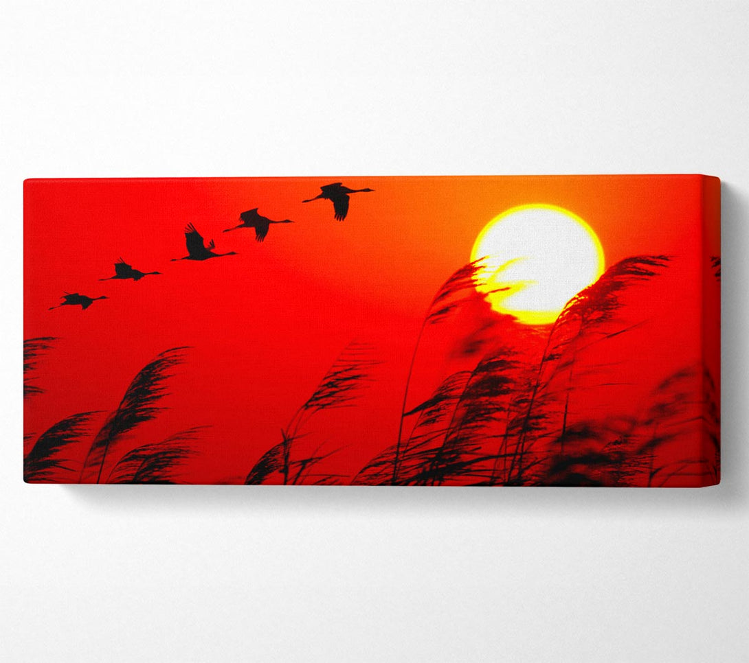 Picture of Geese In Flight Under The Red Sun Panoramic Canvas Wall Art