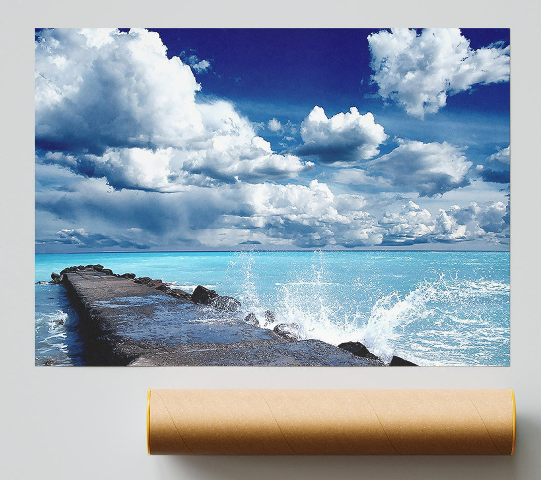 Our Gentle Waves Crashing In The Cloud Filled Sky Poster is printed 260 GSM premium lustre paper that offers vibrant colours and exceptional detail.
