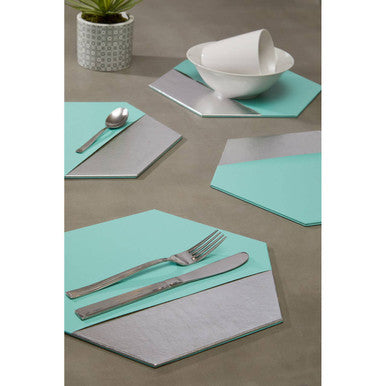 These stylish leather effect hexagonal placemats feature a contemporary two-tone design, combining a bright jade finish with silver accents. Perfect for adding a modern touch to your dining table, they protect surfaces from spills while elevating your decor with geometric flair.