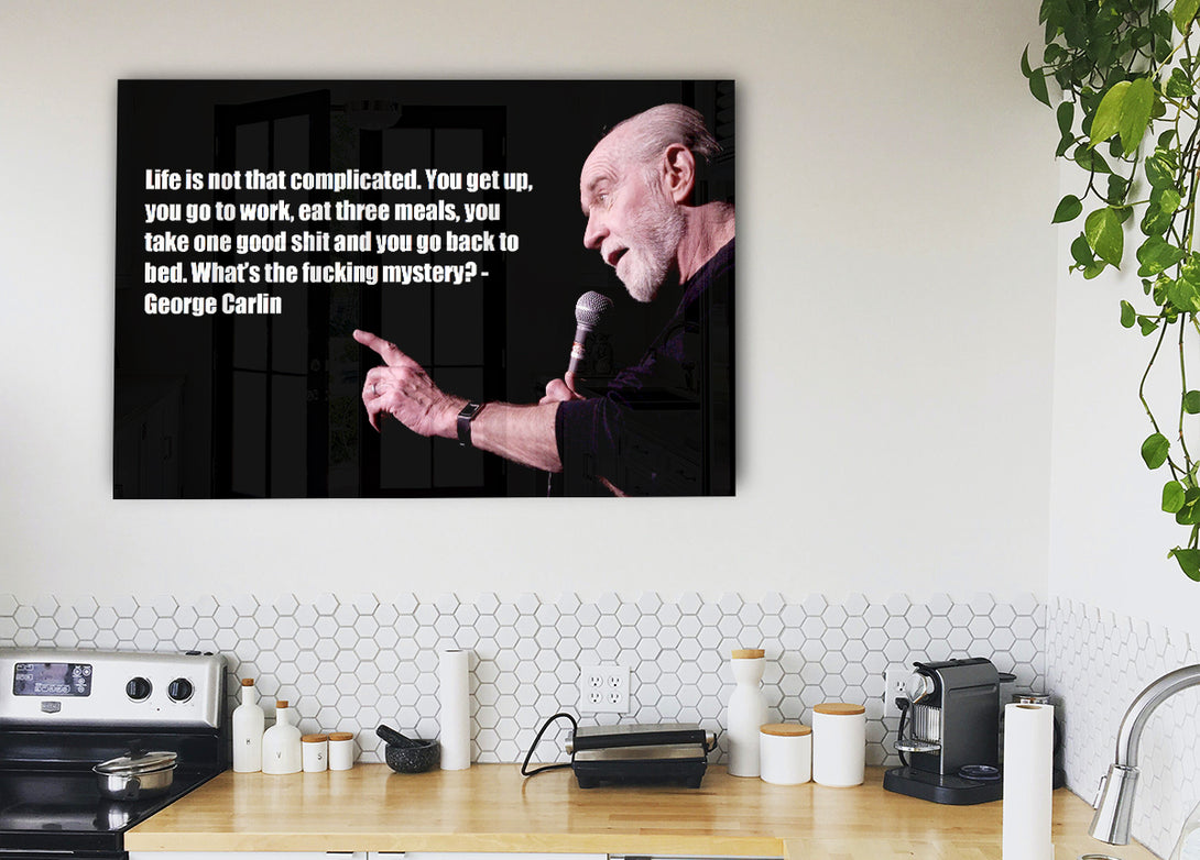 George Carlin acrylic print, UV printed onto 5mm thick acrylic glass. Comes with everything you need to hang on your wall.