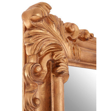 The series of rounded ridges give the mirror's frame a voluminous look, its rich gold finish accentuating the lines and curves. Each corner is garlanded with elaborate floral carvings, adding to the sense of neoclassical symmetry. Suited to luxurious boutique hotel design settings, use it to add a touch of drama above a fireplace or console table.